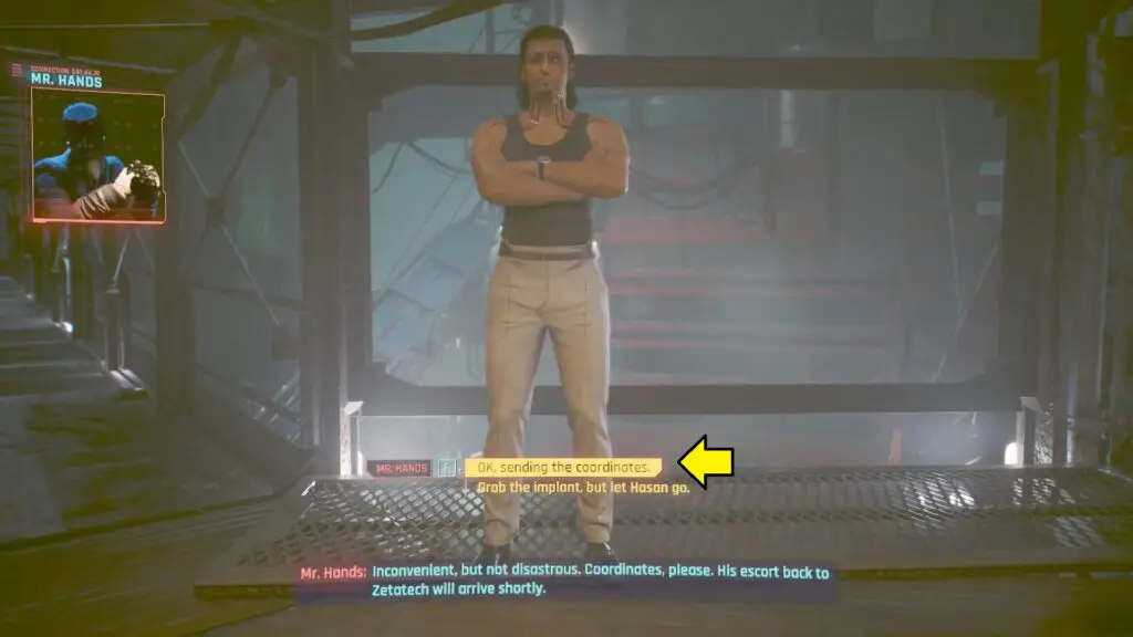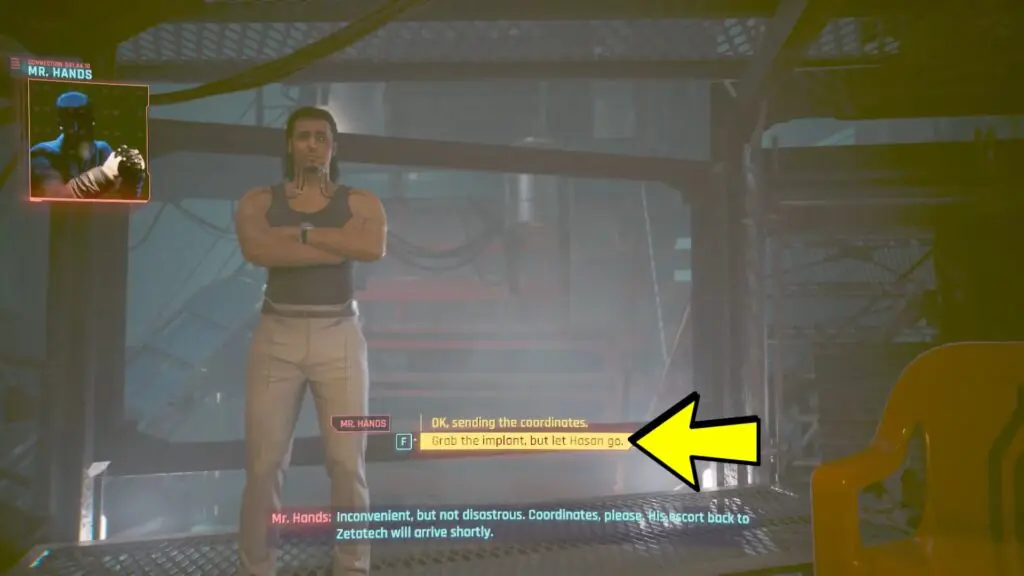 Hasan will make a pledge not to send him back to Zetatech, as it would essentially be a death sentence for him. If the player decides to pursue the prototype, they will contact Mr. Hands, who will then request the coordinates for Hasan. Select below dialogue options below as shown in the images.