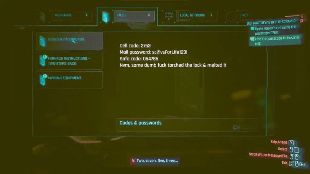To help Hasan escape from his cell, you must obtain the passcode. Go upstairs from the staircase you came down and interact with the laptop. On the laptop, navigate to Files > Codes & Passwords, and you will discover the cell code 2753.