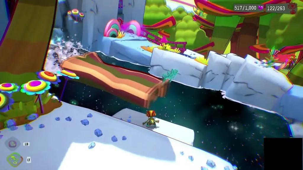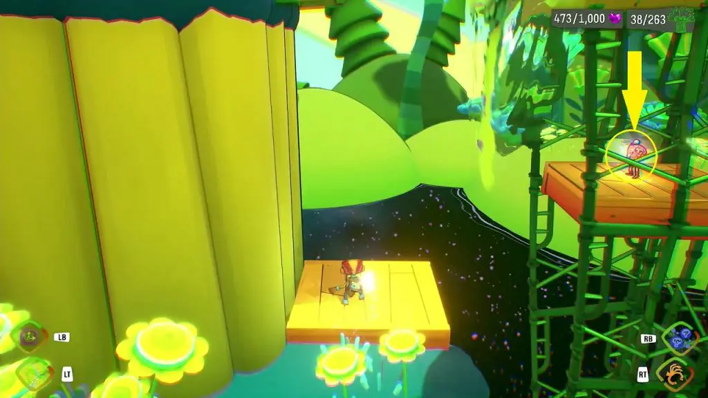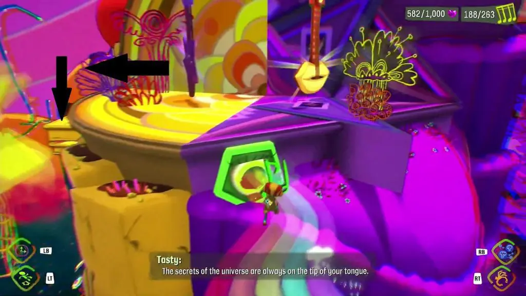 This Nugget of Wisdom is in the area where you reach to find Sniffles and Tasty. In this area, after crossing the first rainbow bridge, you will see two floppy tongues. The Nugget of Wisdom is above one of the floppy tongues. Use Time bubble to slow down the floppy tongue and then use the trampoline in front of it to jump and get the Nugget of Wisdom.