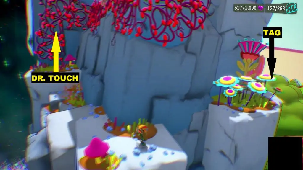 You will find Suitcase Tag in the woods section. In this section, you will find a waterfall with wood logs floating on it as shown in the picture below. Use Time Bubble ability on the wood log to cross the water. After that, you will have to climb the mountain using the vines to reach Dr. Touch at the mountain top. Instead of going to the top of the mountain, go around the side to reach the tag (See the second picture below).