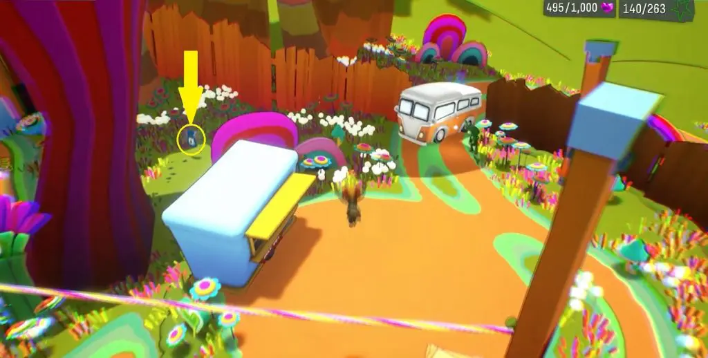 This one is in the woods section of PSI King’s Sensorium. You go to the woods section by driving the bus. In the woods, go to the mountain top near the waterfall (You will have to talk to Dr. Touch here as part of the main mission). On reaching the top of the mountain, turn left and you can see the Half-A-Mind on the other side of the waterfall as shown in the picture below.