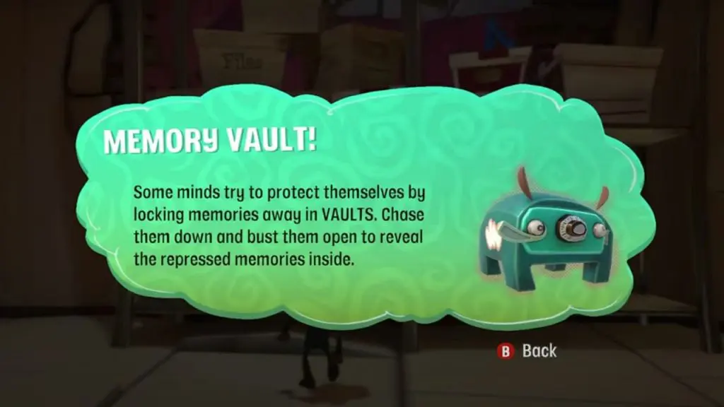 Memory Vaults are a type of collectible item in Psychonauts 2. It has the shape of a cute little pig-like safe. Each mind has two or fewer Memory Vaults running around. In Psychonauts 2, there are a total of 20 Memory Vaults. You can attack them with a melee attack only to reveal a slideshow with a backstory on the character whose mind you are currently inside.