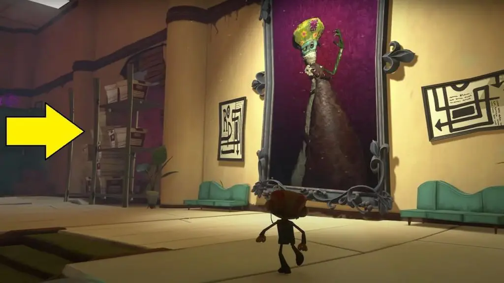 It is available in the Printing section when Raz is told to collect evidence. To find it, go to the top of the printing area, climb up the books to the left, and look for a paper door in a book at the corner. Enter it to be teleported to another location on the map. Climb to the area’s apex to find the second Memory Vault.