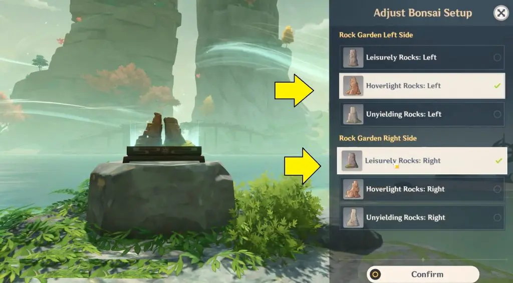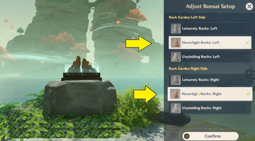 Go to the bonsai island and change the stone formation on both sides of the bonsai to Hoveringlight Rocks.