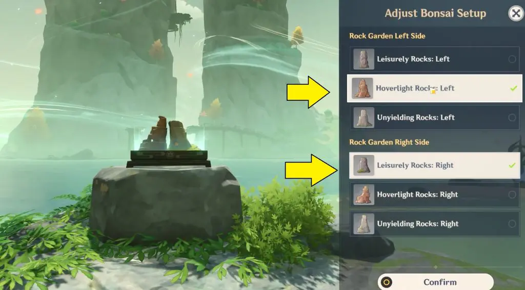 Go to the bonsai island and change the stone formation on both sides of the bonsai. Select Choose “Hoverlight Rocks: Left” and “Leisurely Rocks: Right”