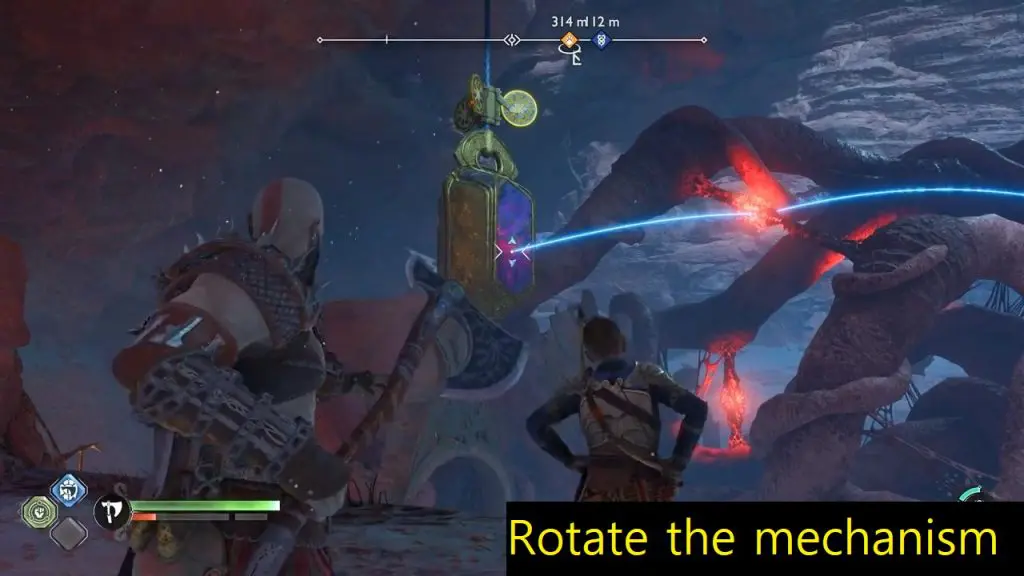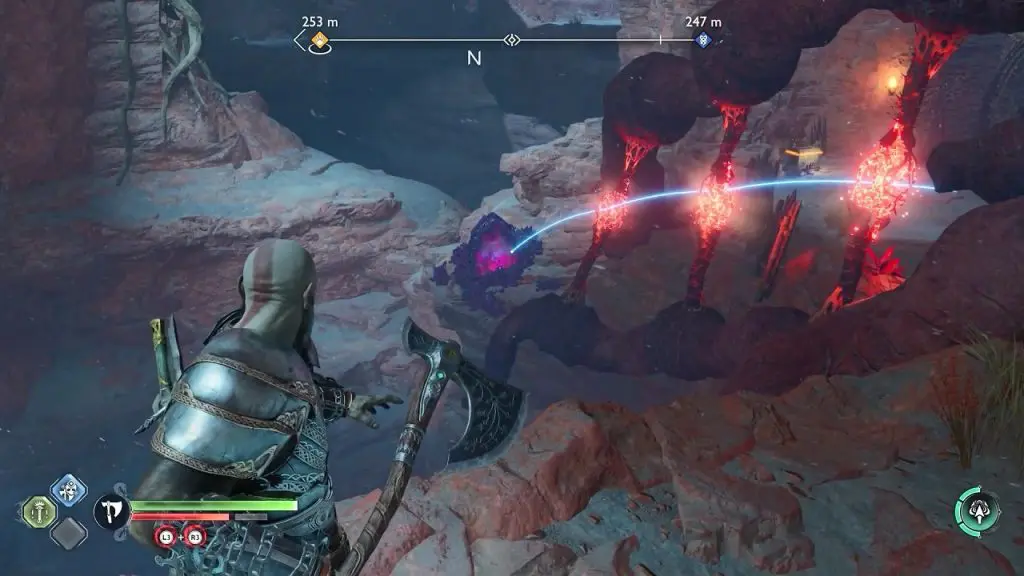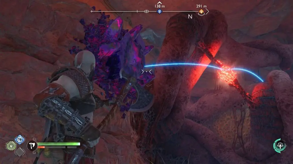 Grapple across the mountain walls and then throw your axe at the purple crystal to clear the blockage.