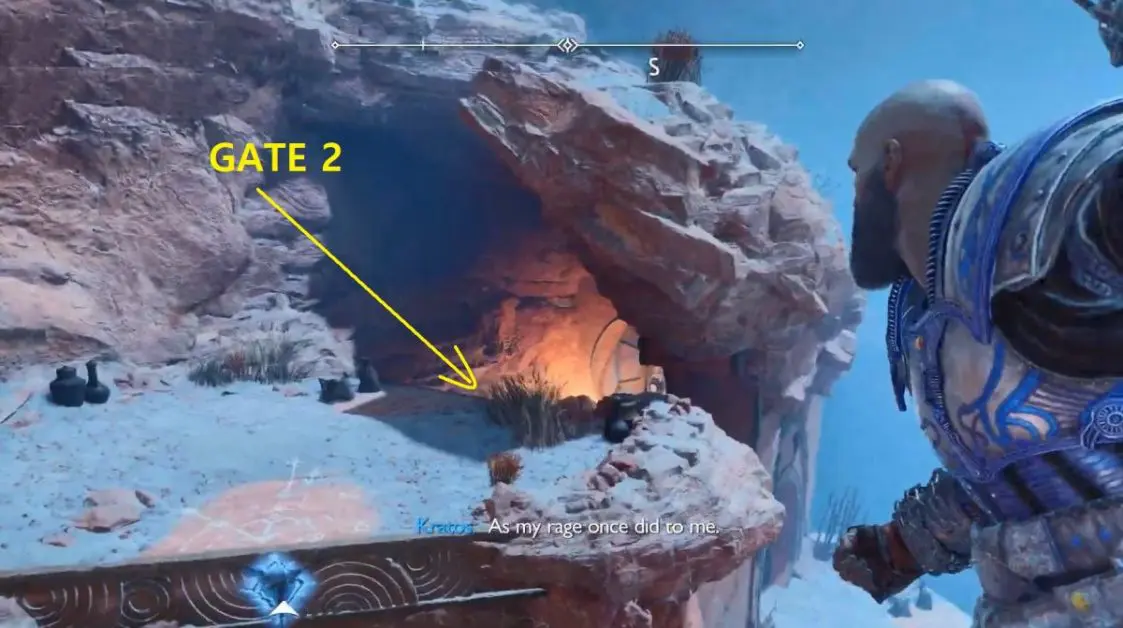 Once on the other side, turn right to locate a climbing section on the mountain wall. There are two gates on the other side of the gap. You need to go inside GATE 2. Please see the image below.