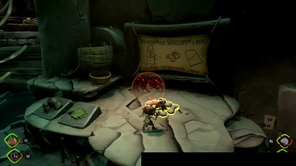 One PSI Challenge Marker is inside the Cave of Sassclops (Location marked as C on the map). Go inside the cave and burn the picture in front of the campfire (see the second picture below). Go inside the newly opened area and there you will find the PSI Challenge Marker at the top platform (see the third picture below)
