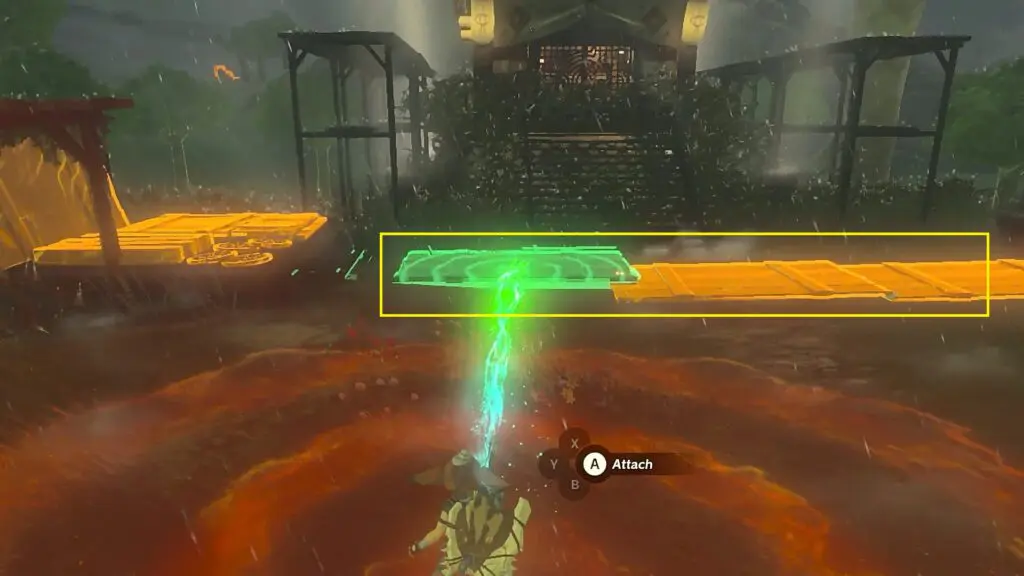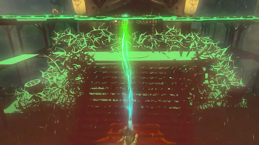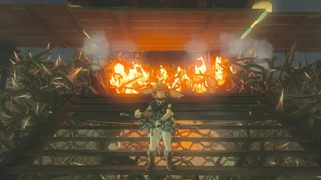 Now lift the planks and place them above the vines by supporting them on the platform on either side of the tower as shown in the picture below. Now the vines will be protected from rain. Use fire fruit to burn the vines as shown in the second picture below. Then open the gate and go inside to activate the tower.