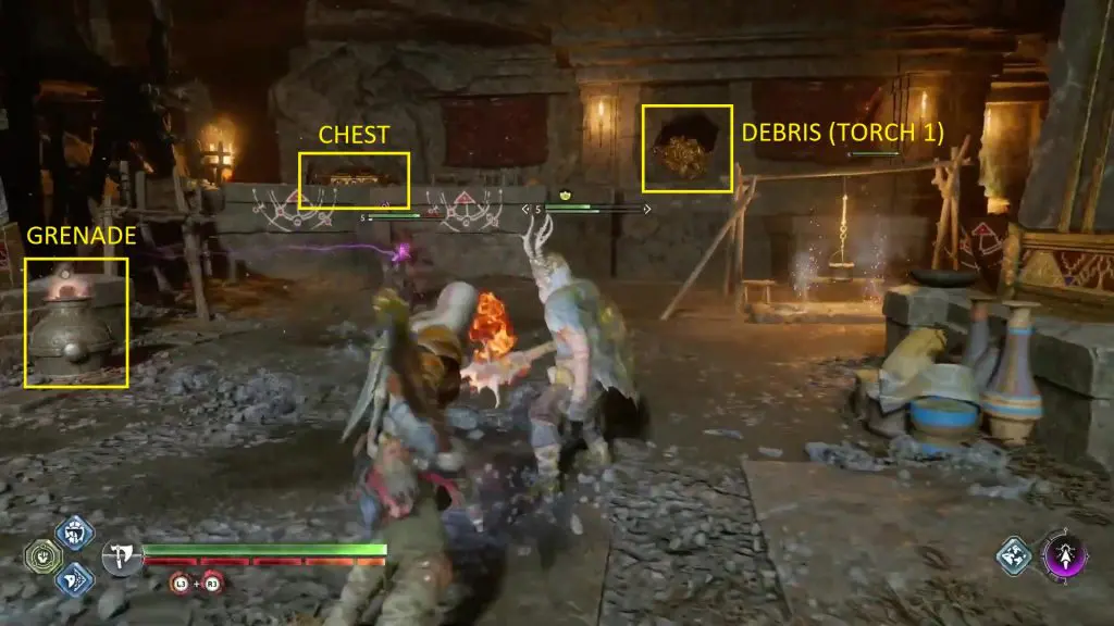 On the right side of the chest, you will see some golden debris as shown in the picture above. Pick up the grenade there and throw at the debris to destroy it, revealing the torch behind it. Now throw a grenade at the torch to ignite it.