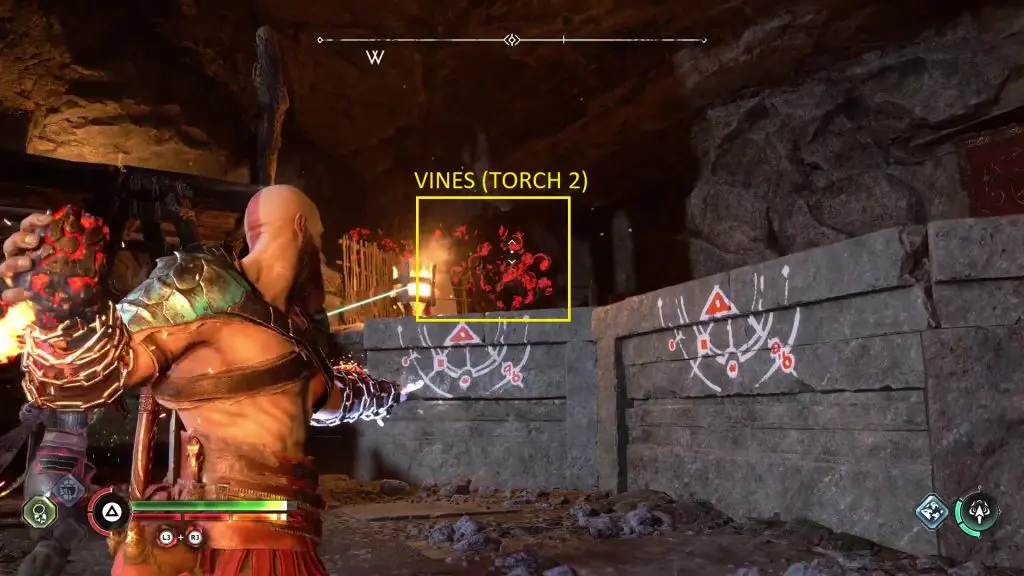 Torch #2 is behind the red vines on the left side of the chest as shown in the picture below. Shoot the vines with purple arrows and throw a grenade at them to cause an explosion and burn the vines, revealing the torch behind it. Now you can throw a grenade on the torch and ignite it.