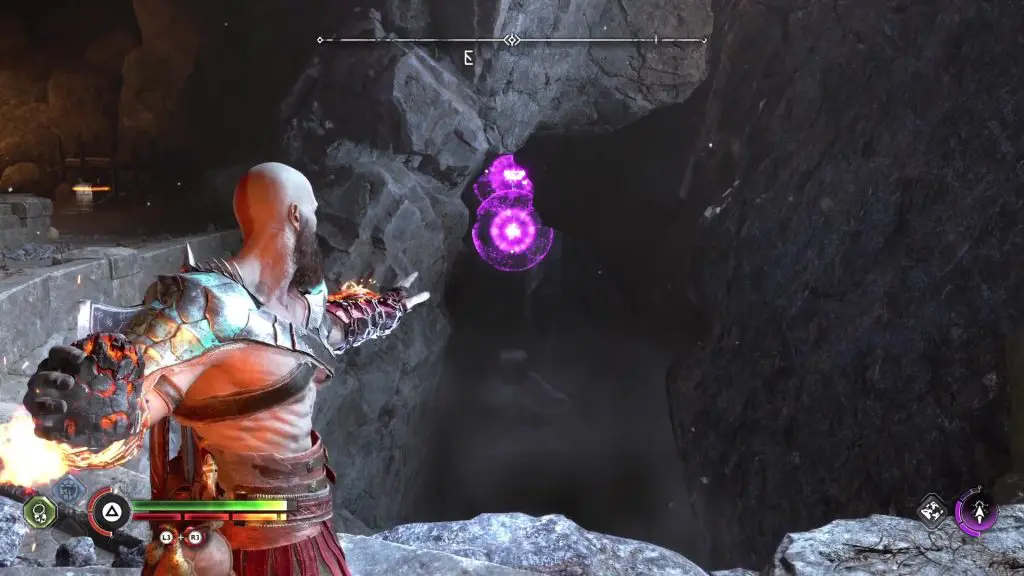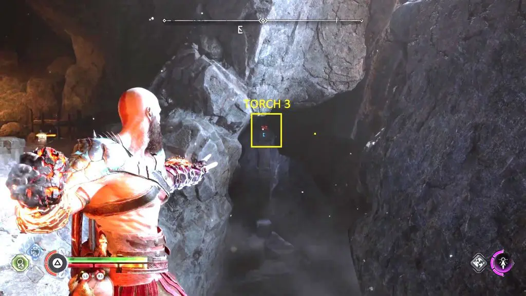 Torch #3 is hanging on top of the giant pit on the right side of the cave as shown in the picture below. The torch is very far and it is difficult to hit it with a grenade. Shoot purple arrows on the torch as shown in the second picture below. Then hit it with a grenade to ignite the torch. This will unlock the chest. Open it to get an Idunn Apple.