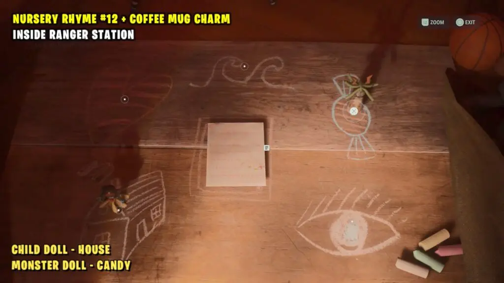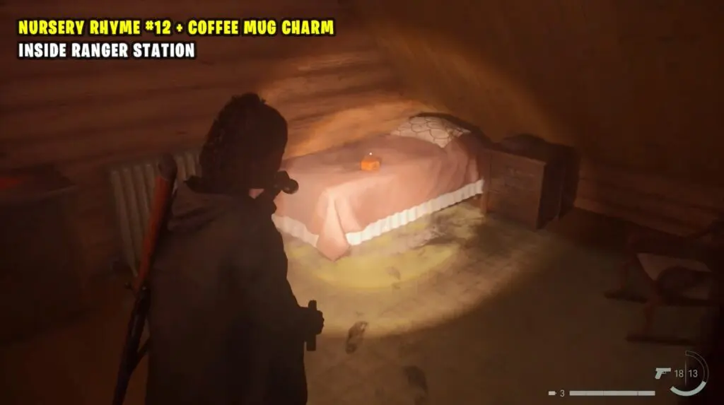 Once you solve the Nursery Rhyme Puzzle, open the backdoor of the Ranger Station. Then, turn around and you’ll see black footprints on the floor inside the house. Follow these footprints upstairs to the bathtub, and then turn around again to follow them to the bed. The charm will appear on the bed.”