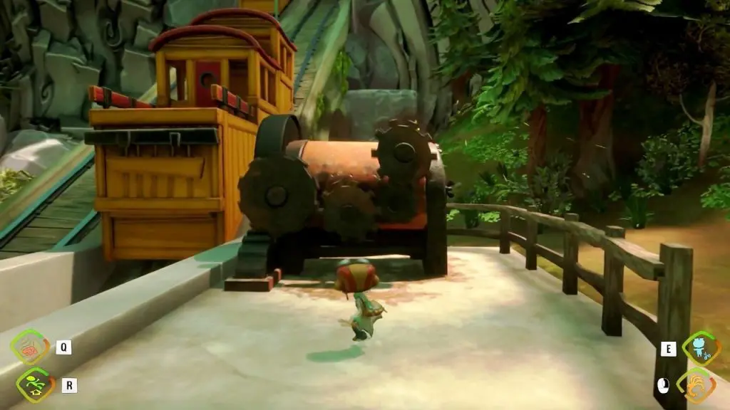On reaching the Funicular you will see that it is not working, as it is missing three cogwheels. One cogwheel is right in front of the machine. One is on the right side, resting on a rock. the third cogwheel is on the left side of the rides as shown in the picture below. Use telekinesis to place the cogwheels on their slots in the machine (see the second picture below). This will fix the Funicular. Now ride it to the top.
