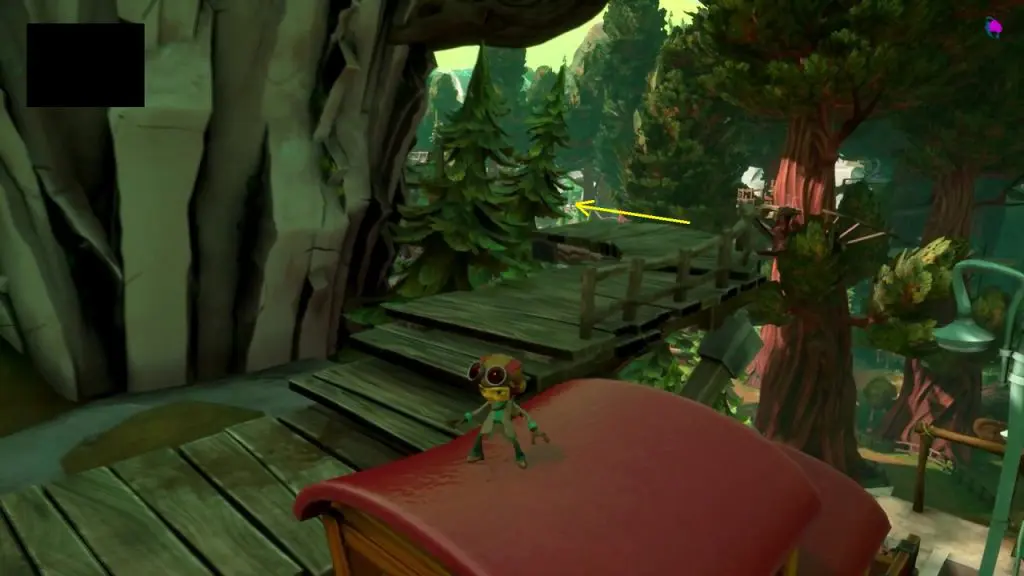 The waterfall you reached flows in the reverse direction. On the waterfall, you will see wooden logs flowing upwards. Use Time-Bubble ability to slow down a log. You will learn the Time Bubble ability during the “PSI Kings Sensorium” level. Jump up on the slowed-down logs and ride it upstream. The log will pass through a hidden cave behind the waterfall (see the second picture below). Jump from the log to reach the hidden cave.
