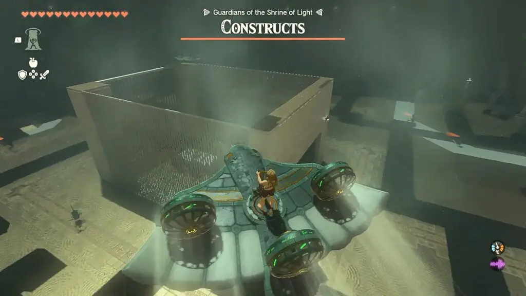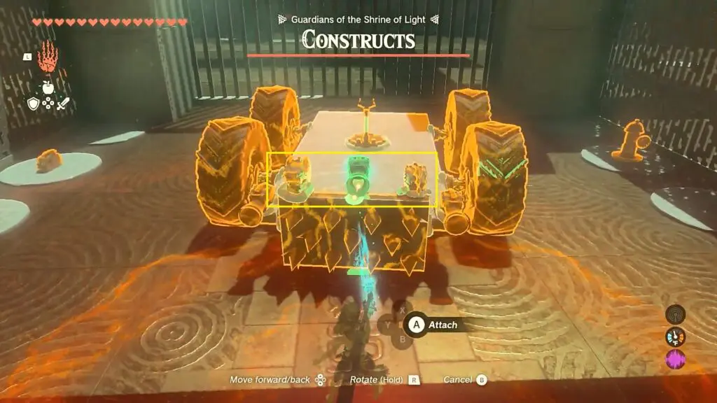 You will find a tank inside the cage. Attach a fire thrower, Shock Spear, and Cannon in front of the tank as shown in the picture below. Then step on the switch near the gate to open it. Now climb up the tank and defeat all the constructs easily riding it. When you have defeated all the constructs, an iron gate will open. Go through it and get the blessing to complete the shrine.