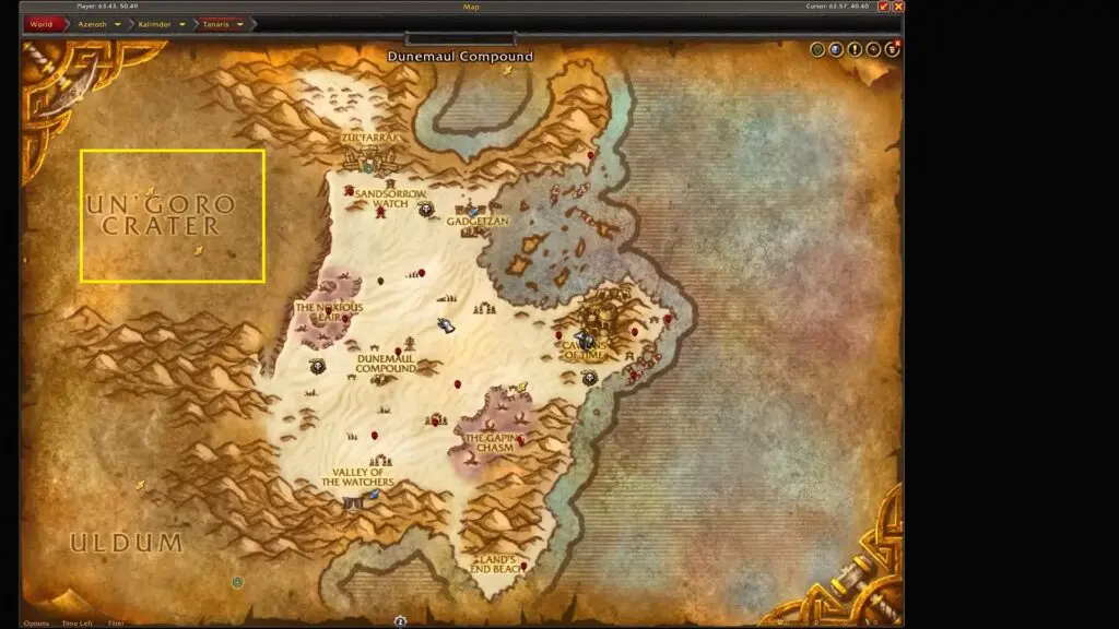 To find the location of the Inert Peculiar Key, start at Tanaris in the Caverns of Time. From the Caverns of Time tent, head west into Un’Goro Crater. Players need to fly toward the giant sword in the ground.