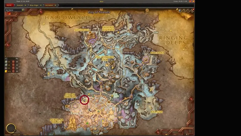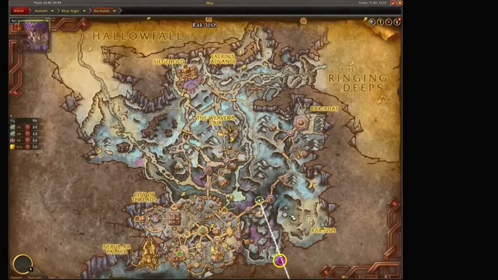To track Rutt, head to Khaz Algar. In Khaz Algar go to Azj-kahet and proceed to the cave at the southernmost point of the map, as indicated below.