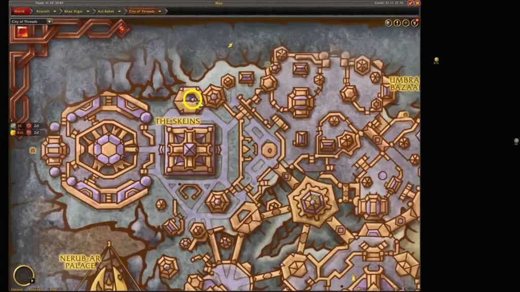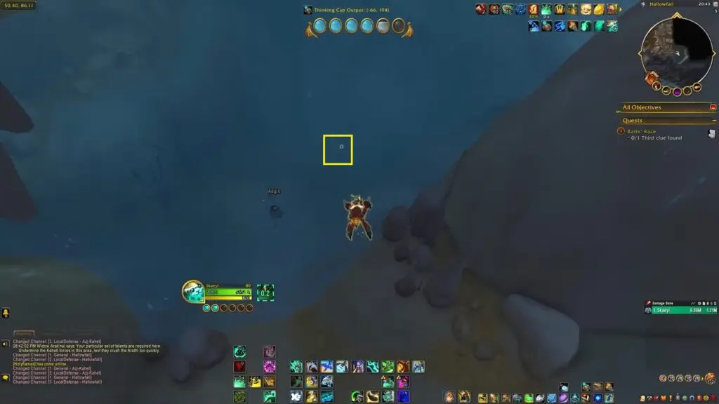 For the third clue go to the “Hallowfall” in Khaz Algar. You will find a small lake or pond of water at the location marked on the map. Swim to the bottom of the lake to find the clue.