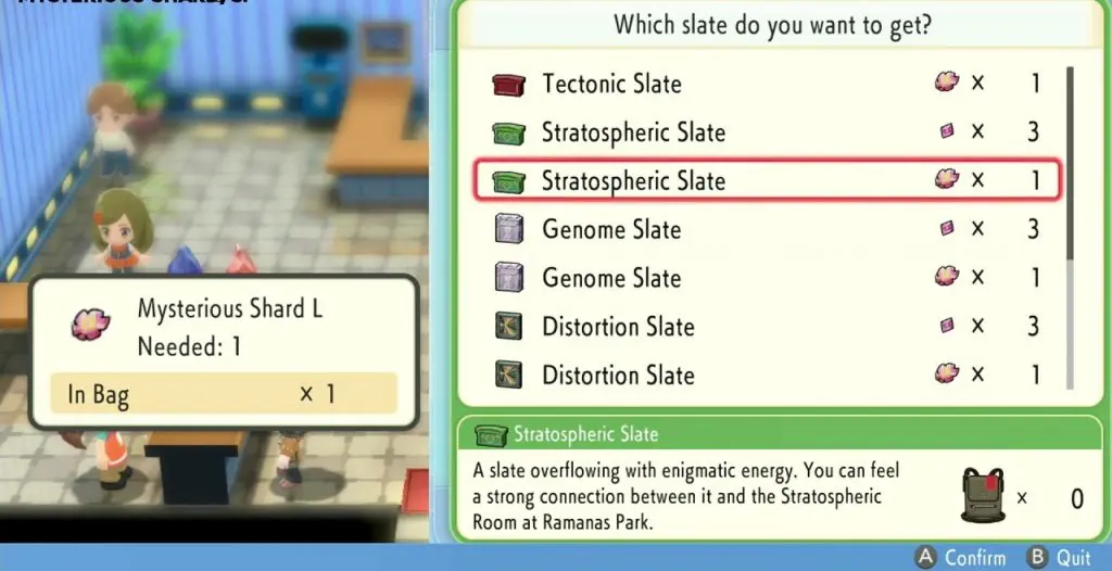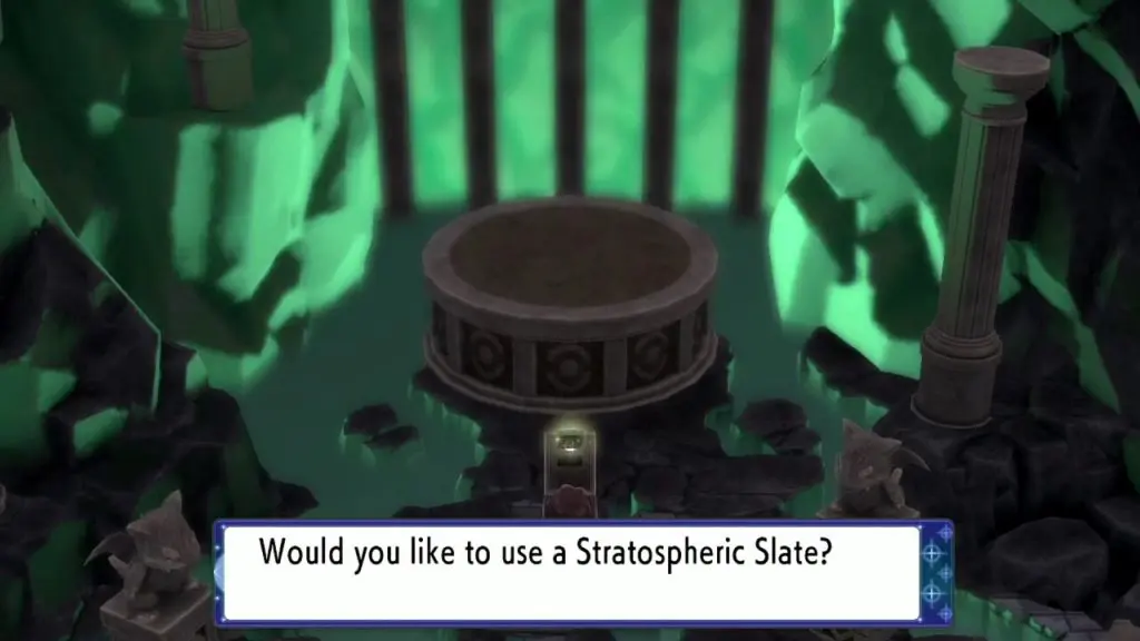 Once you have the three Legendary Dogs/Birds, go back to the Grand Underground and search for 1xMysterious Shard L or 3xMysterious Shard S. Then go back to Ramanas Park and purchase Stratospheric Slate. Now go through the door on the other side of the room and enter the Stratospheric room in Ramanas Park. Place the slate on the pedestal as shown in the picture below. This will make Rayquaza appear.