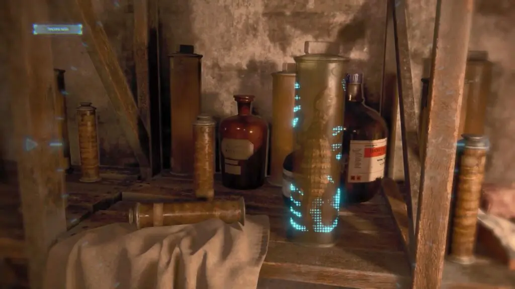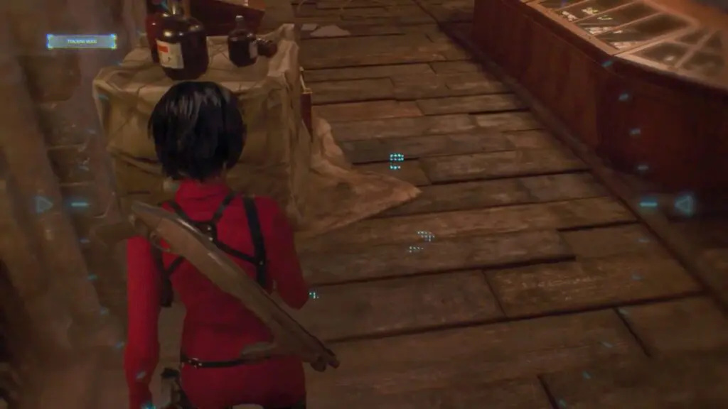 To open the Collection Room Lock Ada need to use the IRIS View to check for footprints. To start, go back to the entrance of the room, trigger an iris view, and look at the ground carefully.