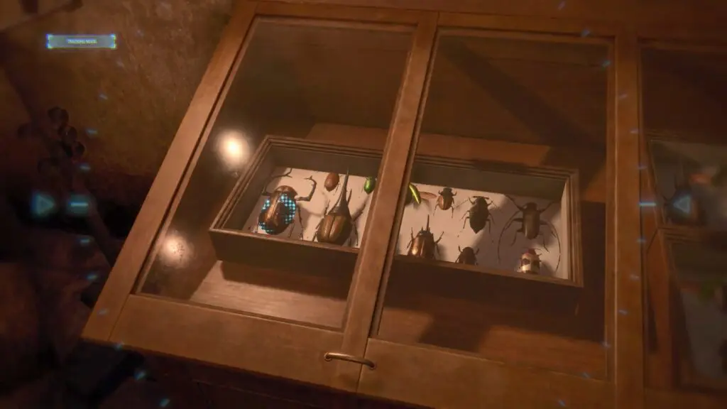 Notice how the footprints of a person go from one exhibit to 2nd exhibit and finally to the third exhibit. You have to follow the exact order to open the lock to get the Blue Butterfly item.