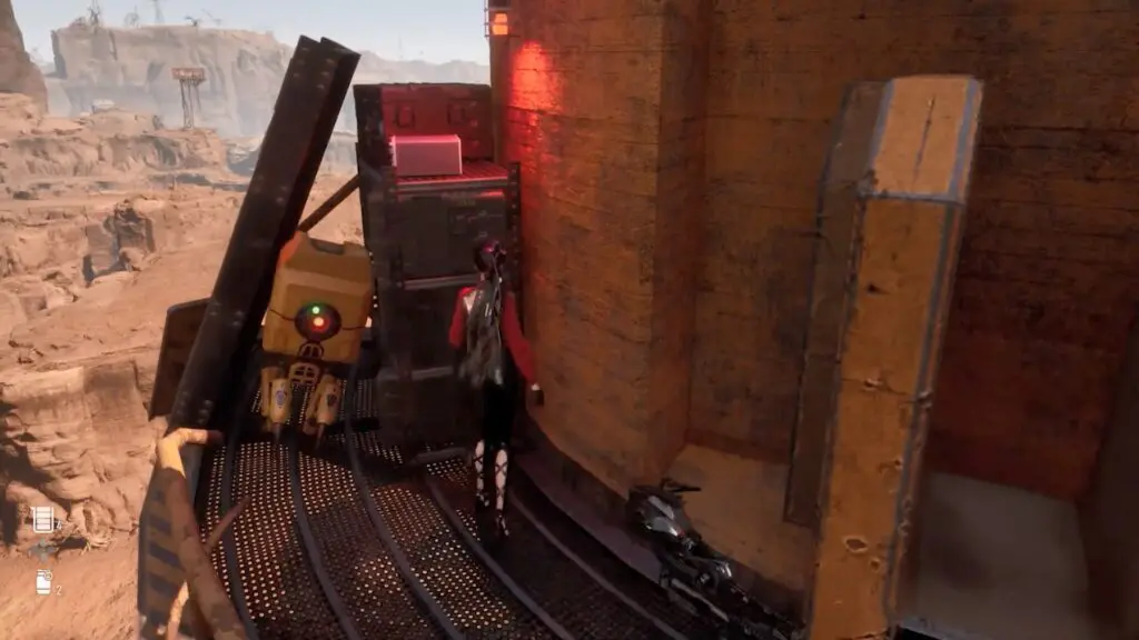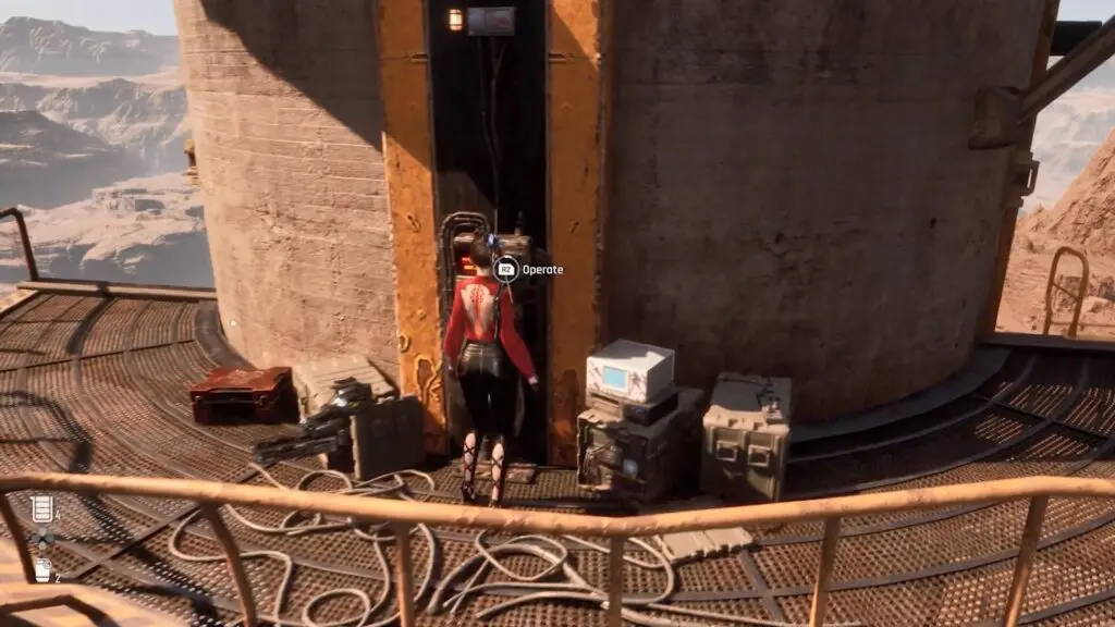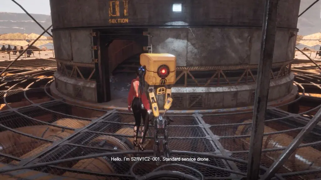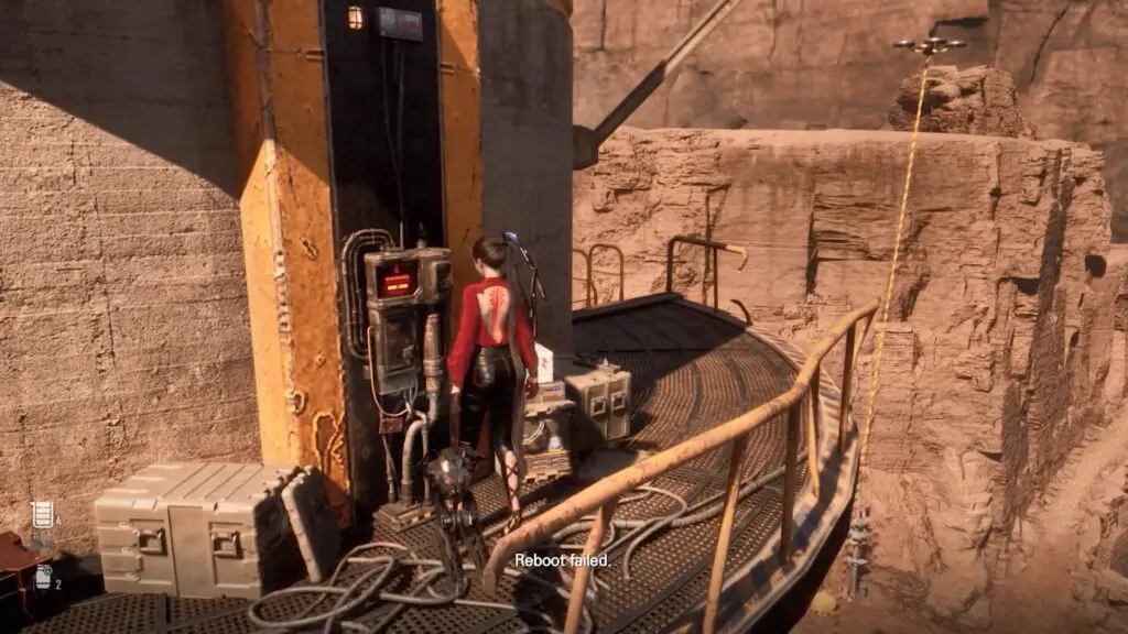 Interact with the drone in front of the Solar Tower’s door to get some clues to solve the power issue.