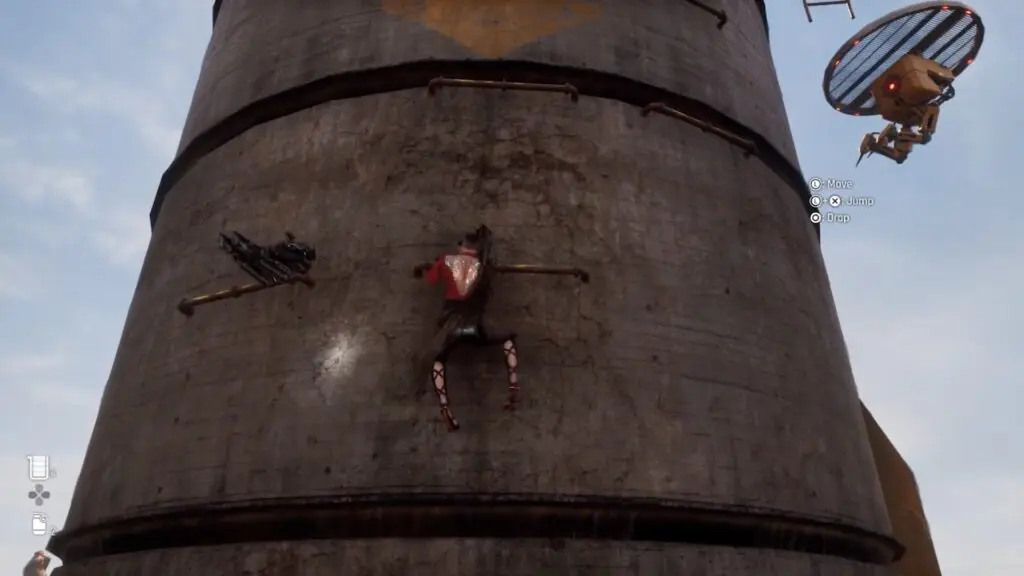 Continue further and climb up a few more platforms to find a yellow drone struck under the debris. Remove the debris to free the drone.