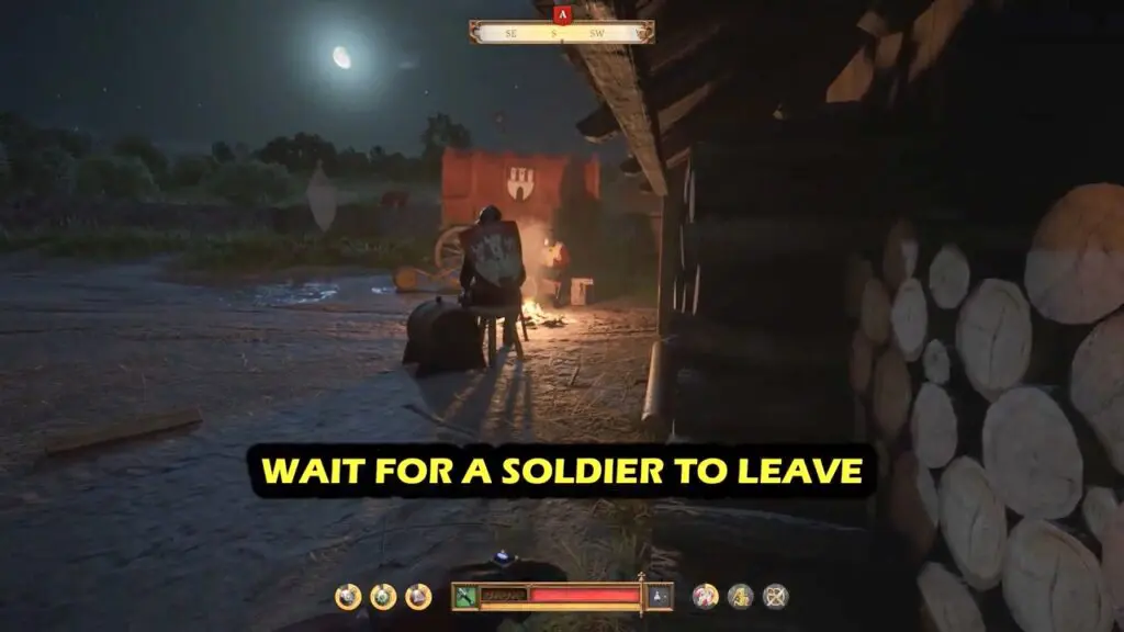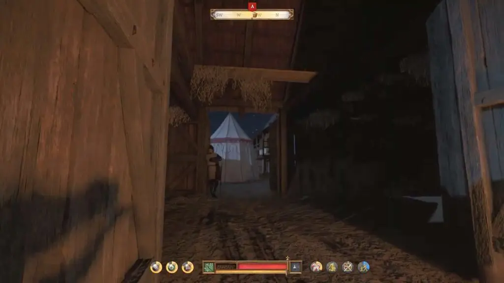 Inside, you’ll find another guard standing in position. Use your crossbow to take him out or throw a stone to distract him and slip by.