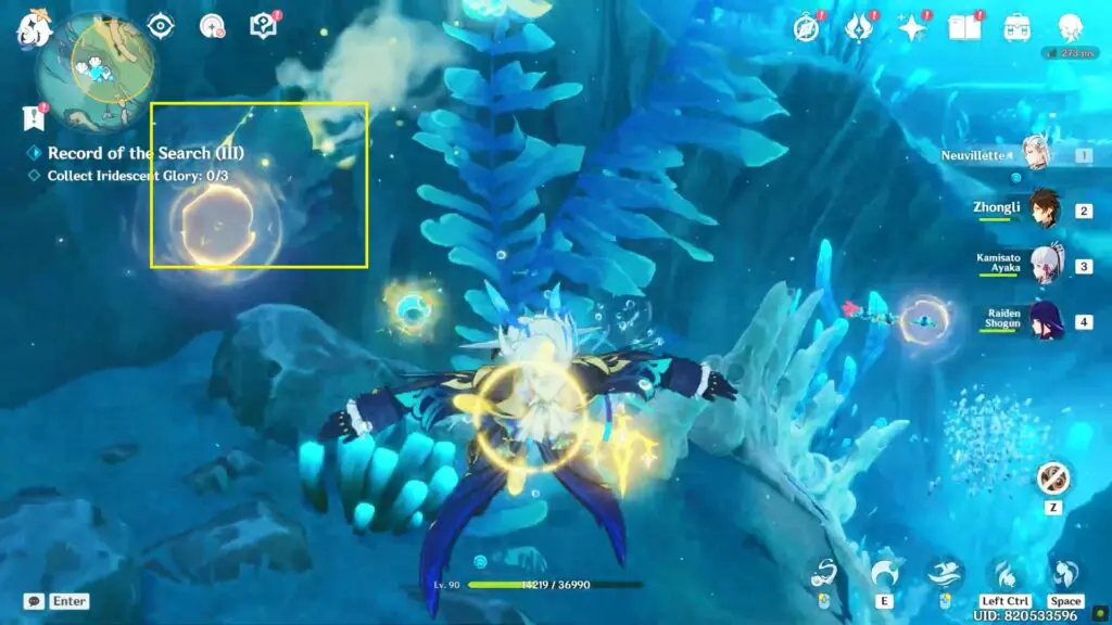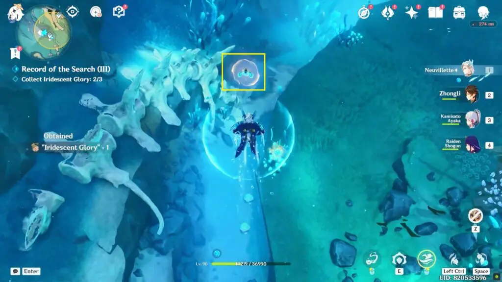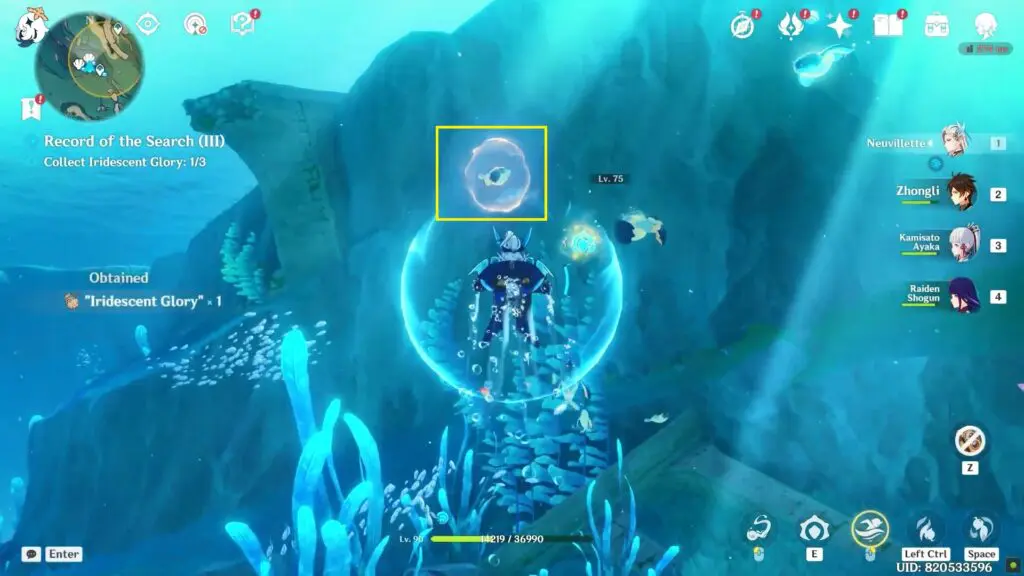 The third day of this sub-event is pretty simple and straightforward, simply go to the marked gold spots around the area to collect three Iridescent Glory. Dive into the water and interact with the Echoing Conch to start the event. Travelers need to search for Iridescent Glory with the guidance of the Echoing Conch.