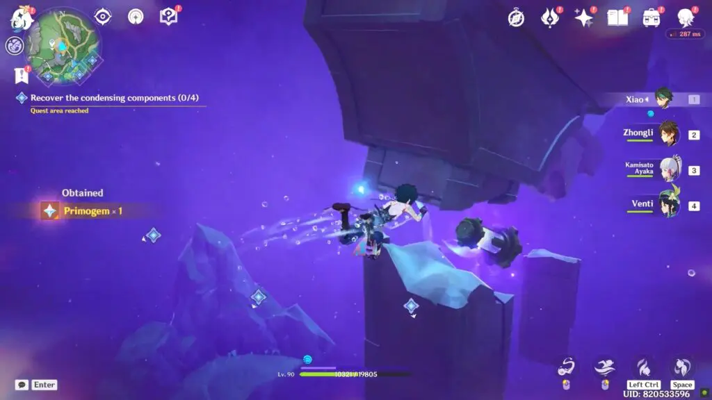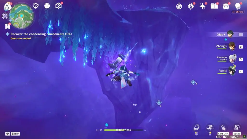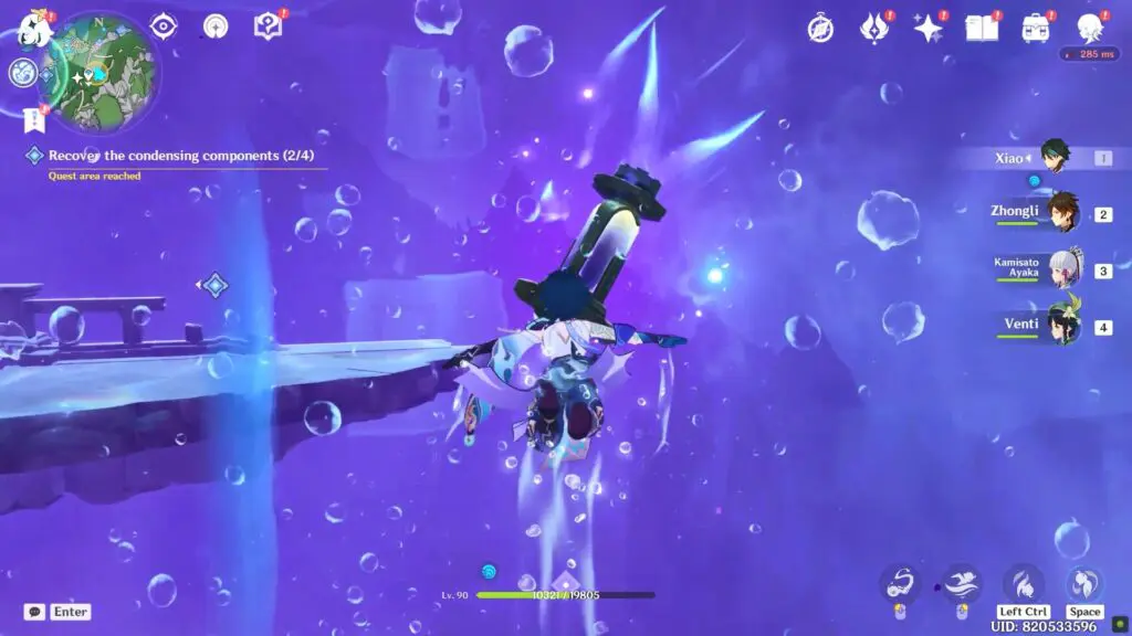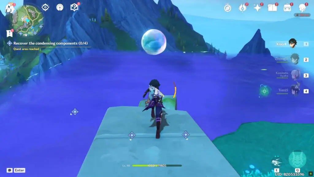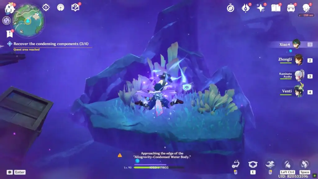 The challenge is located in the north and consists primarily of a parkour. Continue to chase popping bubbles by taking the help of water planks until you get the prompt to enter the purple water. Enter inside to find the Condensing Component between pillars.