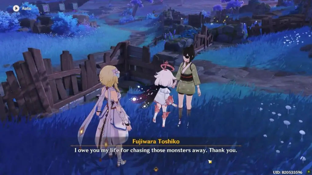 As the quest start, your first objective is to save Fujiwara Toshiko. Head to Koseki village in Seirai Island where you will find Fujiwara Toshiko surrounded by three monsters below the mountain. Defeat all the monsters.