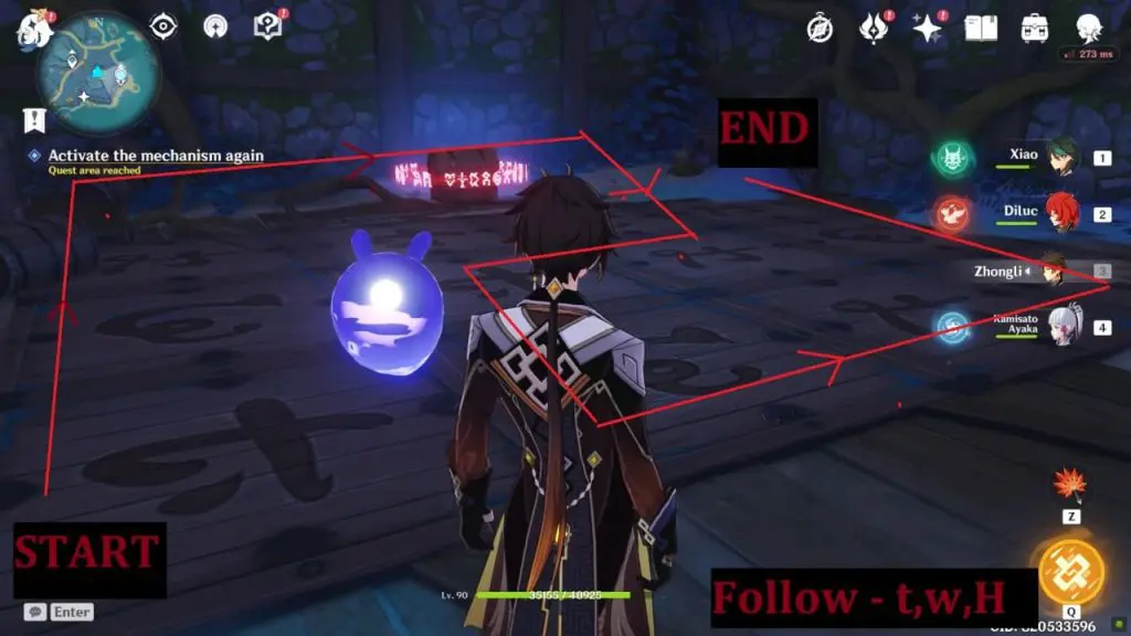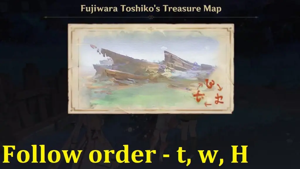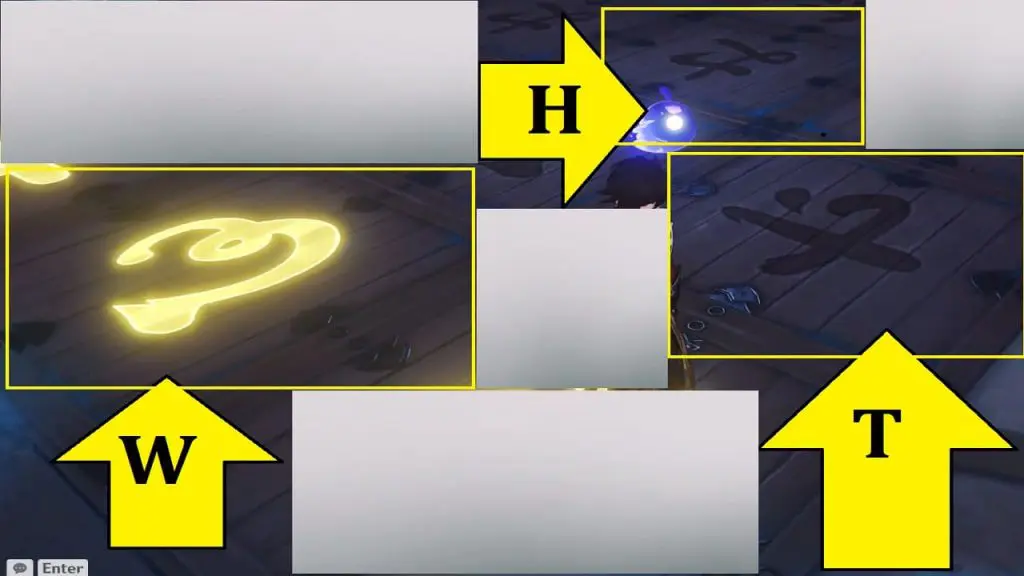 Now your step is to solve puzzles by stepping on three pressure plates in the correct order. You have to walk in such a way that you always step on the three symbols in the correct order. There are three characters “t”, “w”, and “H”. You can start with any character here, the only thing you need is to follow the clockwise order as shown in the treasure map.