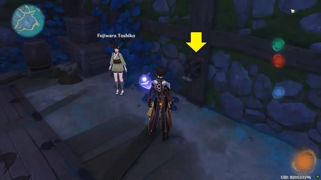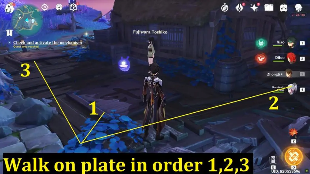 Now follow Fujiwara Toshiko to the treasure location, which is a nearby hut in Koseki village. First, activate the lever mechanism on the wall of the hut. You will find three pressure plates near the hut.