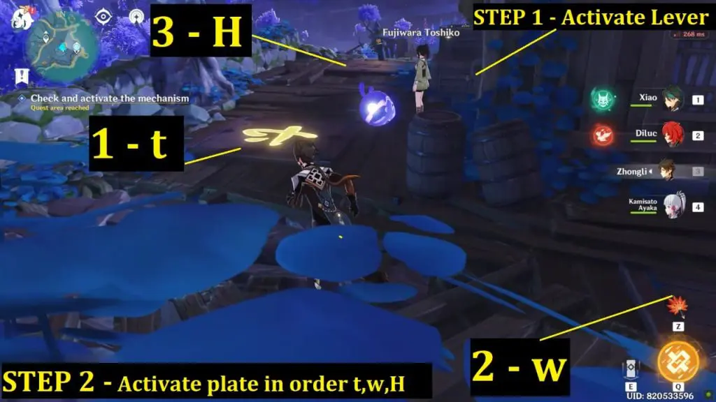 First, activate the puzzle by triggering the lever near Fujiwara Toshiko. You have to follow the same process of walking in the correct order – First plates that look like a “t”, Second plates that look like a “w”, finally on the third that look like an “H.” I have attached a screenshot for reference. Start off at the right side (facing the chest).