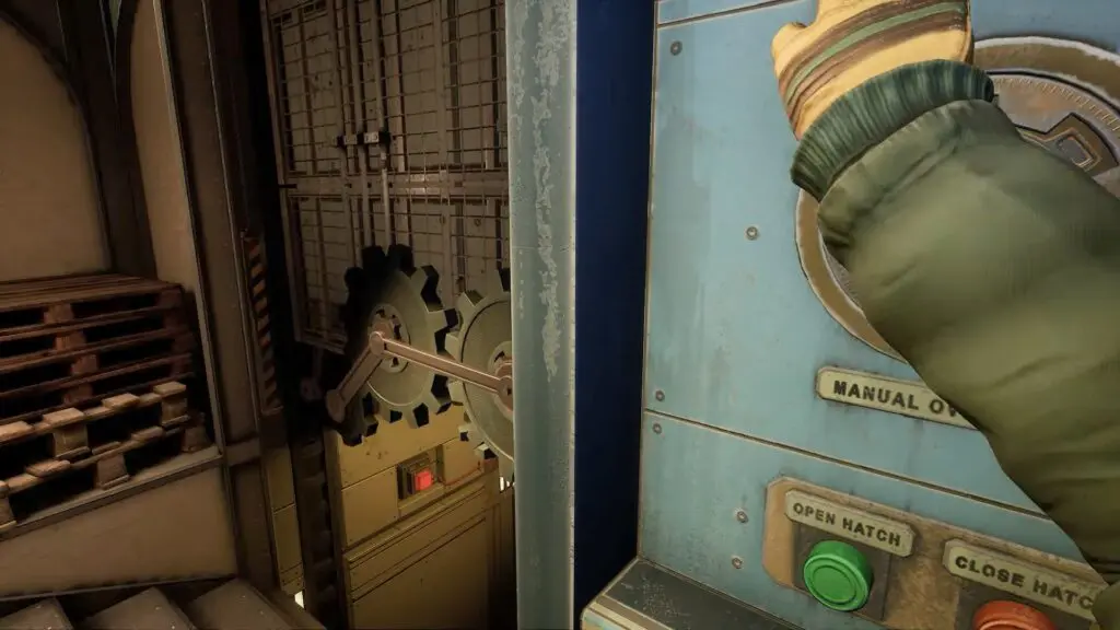 Once the elevator gate is raised, press the green button to open the hatch. This will make it safe to go under the elevator.