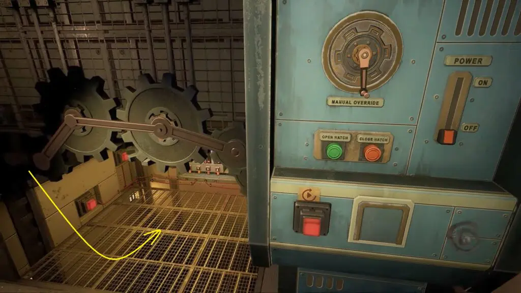 Once repairs are done underneath, leave the elevator and close the hatch by pressing the red button.