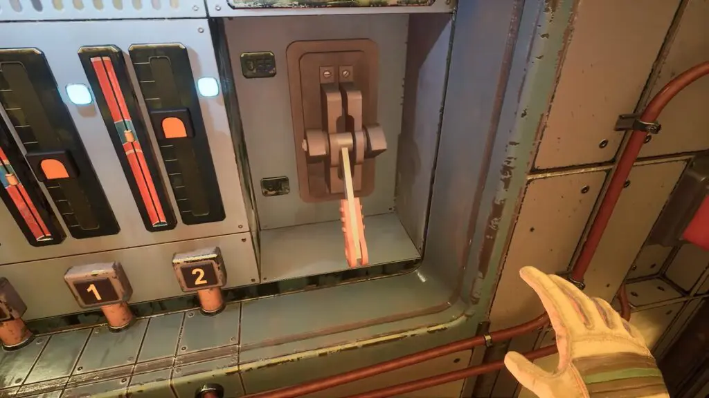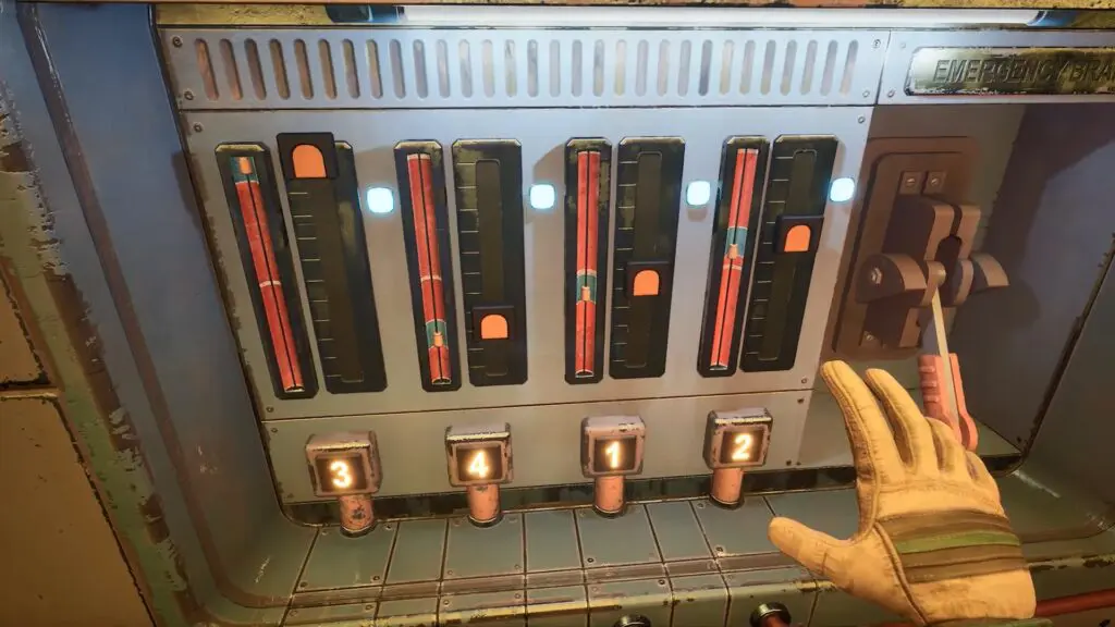 Each scale or slider is marked with a number from 1 to 4, and each one has a wire that leads to a red button. To enter the correct code, you need to press the red buttons in a specific order: 3 – 4 – 1 – 2.