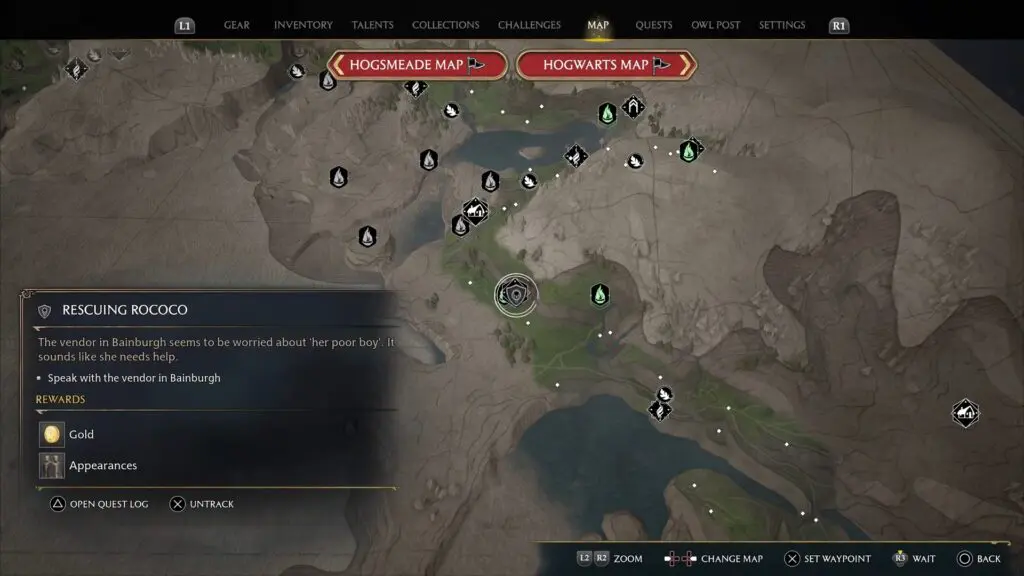 This guide shows the complete walkthrough of the Rescuing Rococo side quest in the Hogwarts Legacy game, which released on 10th February 2023. Once the quest becomes available, talk to Agnes Coffey in Bainburgh at the location shown in the pictures below to start the quest.