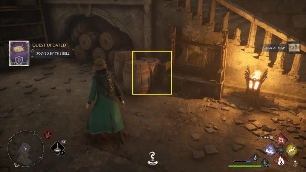 Go inside the secret room. There, you will find a Musical Map for Solved by the Bell Side Quest. In this room, you will find a cube as shown in the picture below. Use Wingardium Leviosa to lift the cube. Then climb up the stairs and take the cube to the hall you came from.