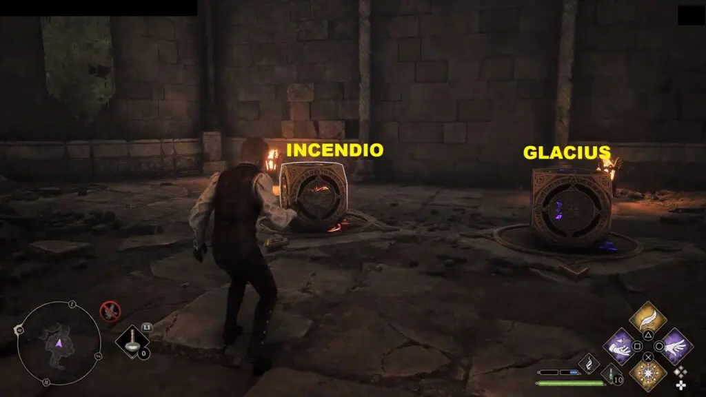 After entering Henrietta’s Hideaway, turn left and light the torch in front of the statue by using the Incendio spell. This will make the statue rotate, revealing a cube. Use the Accio spell on the cube and place it on the plate in front of the wall. Now use Incendio spell on the left cube and Glacius spell on the right cube as shown in the picture below. This will reveal a door behind the cubes.