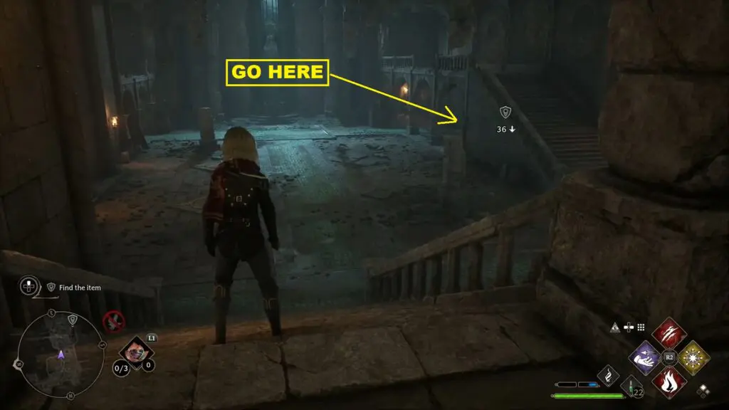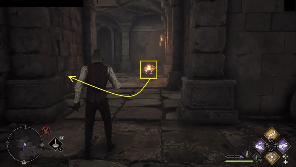 Proceed ahead to the next area and defeat all the enemies there. Then climb up the stairs on the left side. After reaching the top, go left and you will find a hallway. Use Accio to throw the torch inside the left wall in the hallway as shown in the picture below. Or else, use Arresto Momentum on the left wall and proceed ahead.