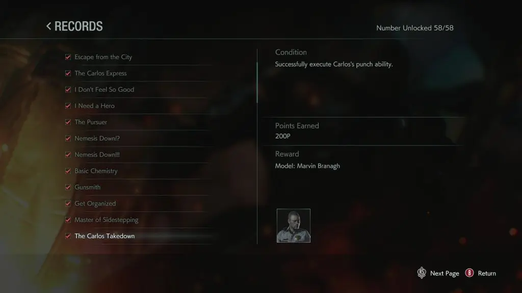 Resident Evil 3 Remake: How to complete The Carlos Takedown Challenge ? Post published:April 9, 2020 Post category:Resident Evil 3 Remake Successfully execute Carlos’s punch ability to complete The Carlos Takedown Challenge. You can punch by pressing Dodge/Charge button.