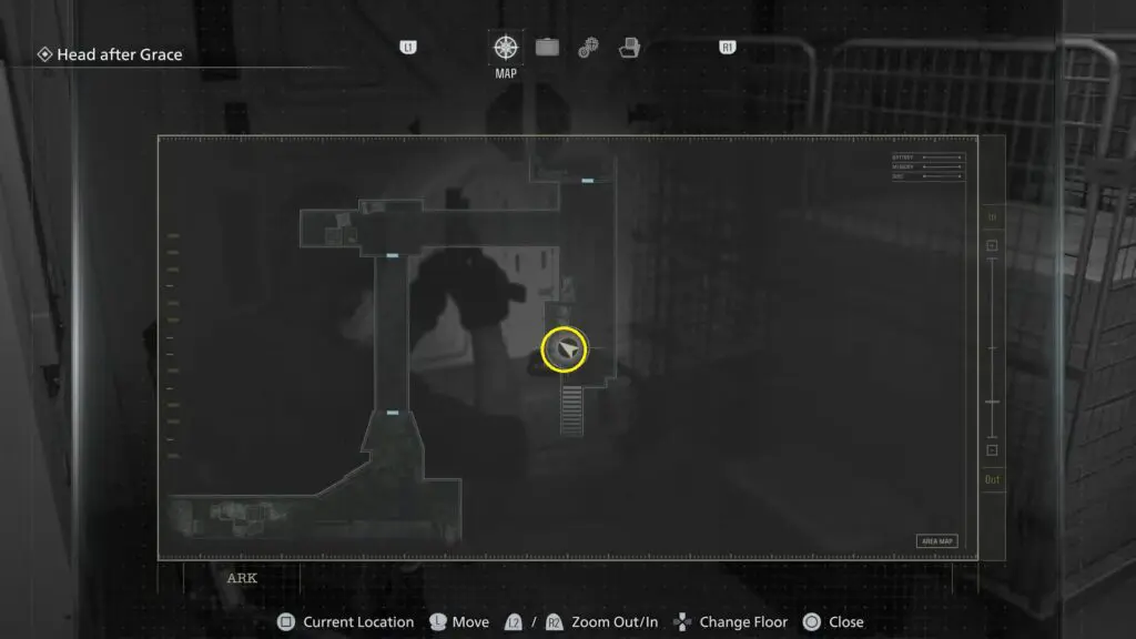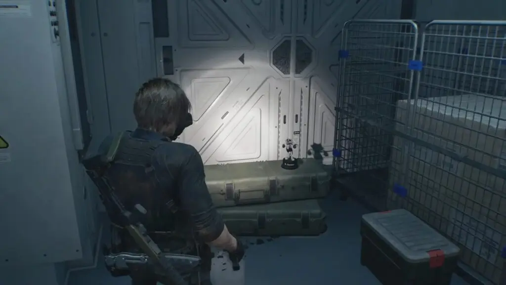 After Leon enters the ARK facility through the Loading Dock, continue forward through the narrow hallway and pass the Guest Room. As you move ahead, look to your right. You will see a toolbox placed along the wall. Mr. Raccoon is sitting on top of the toolbox