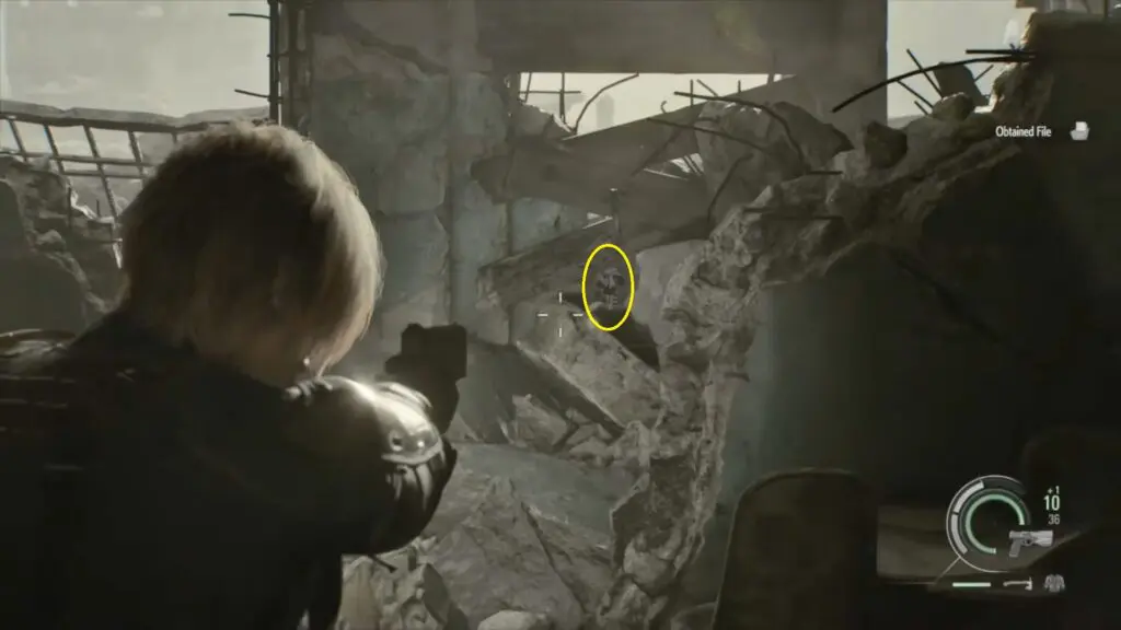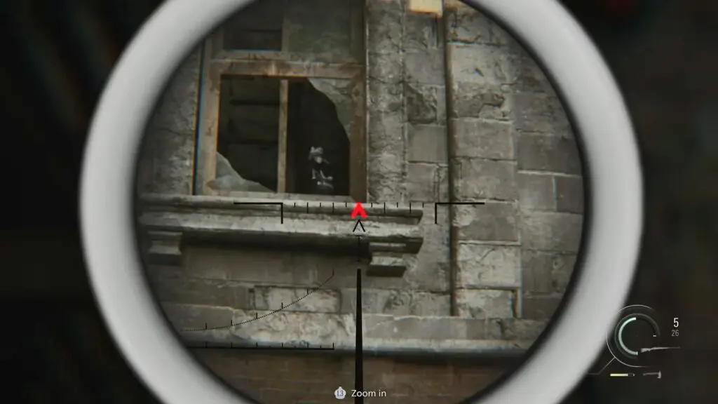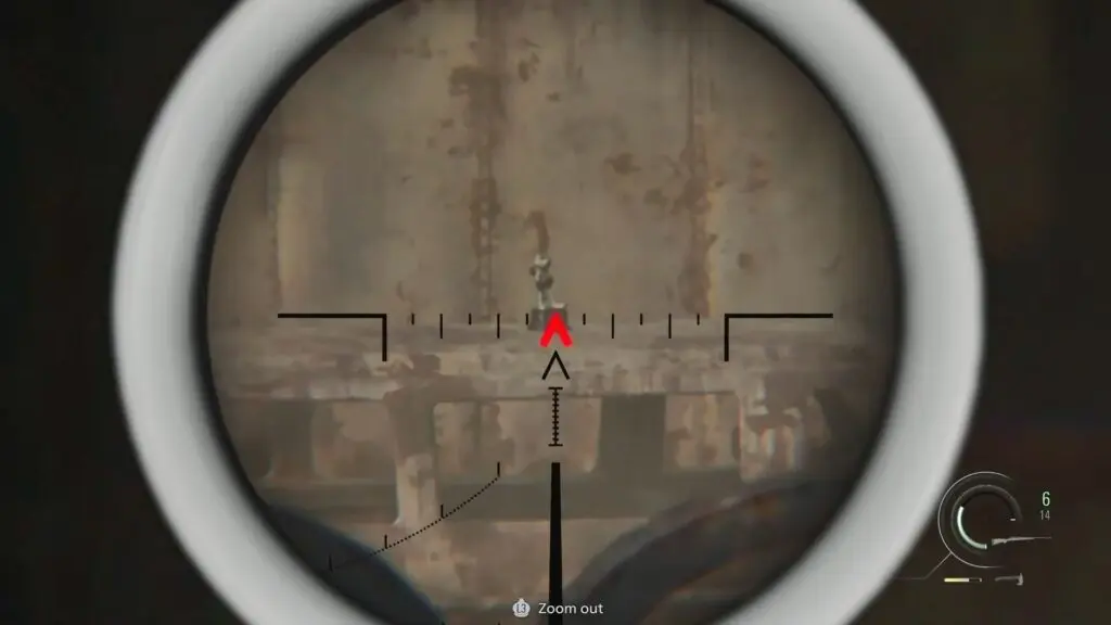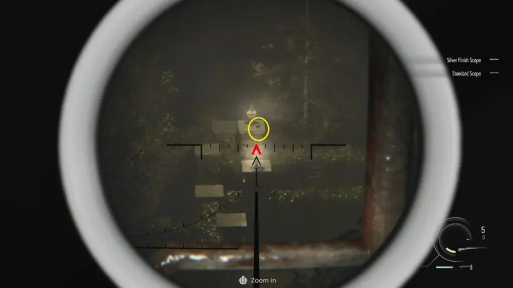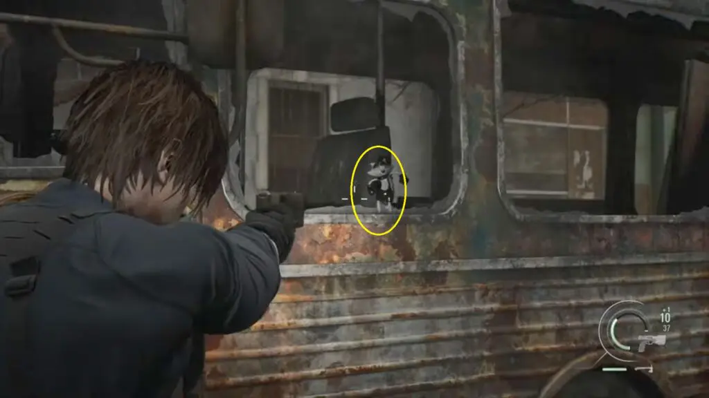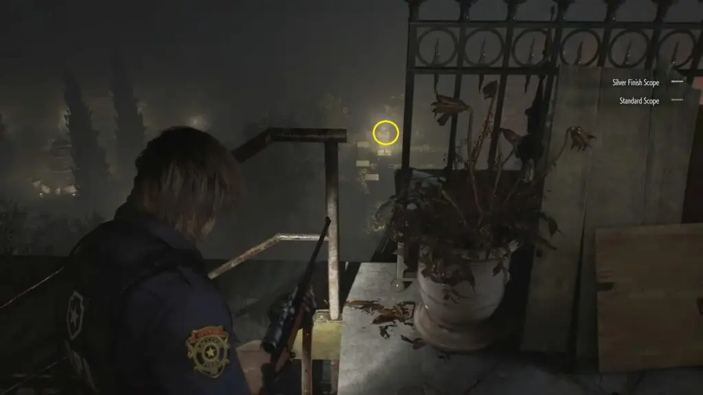 As you progress in the story, you will take control of Leon again and acquire a sniper rifle. You will need to use the sniper rifle to shoot the infected enemies chasing Grace and Emily. While aiming down into the garden, look closely at the pedestal that holds one of the garden lights. Mr. Raccoon is sitting on top of that pedestal.