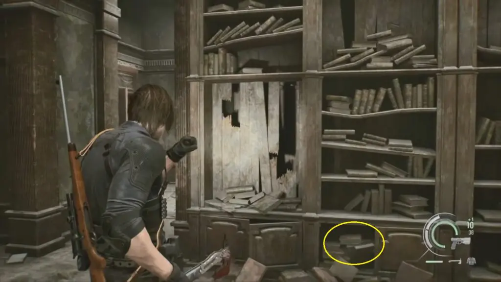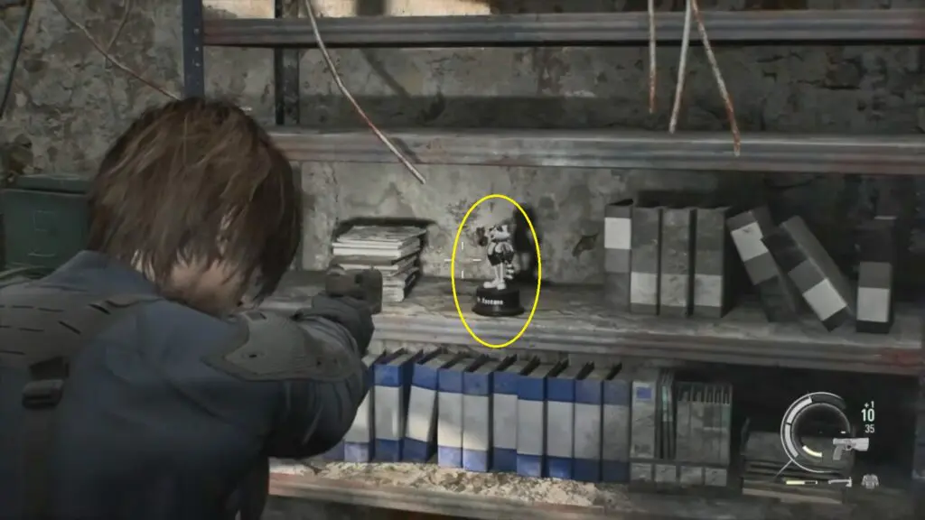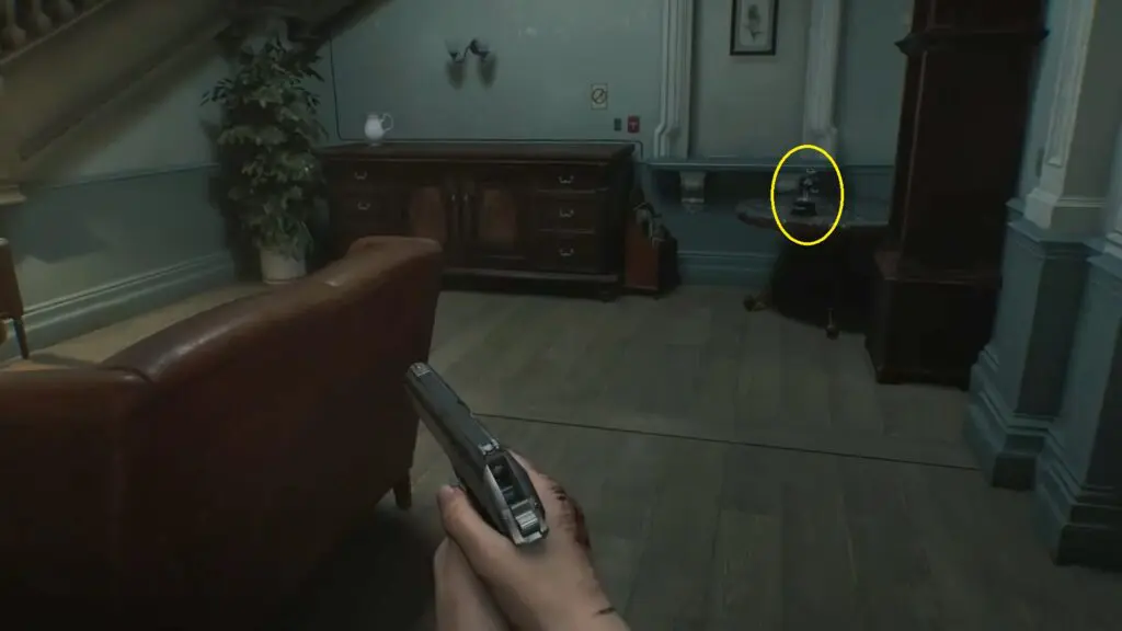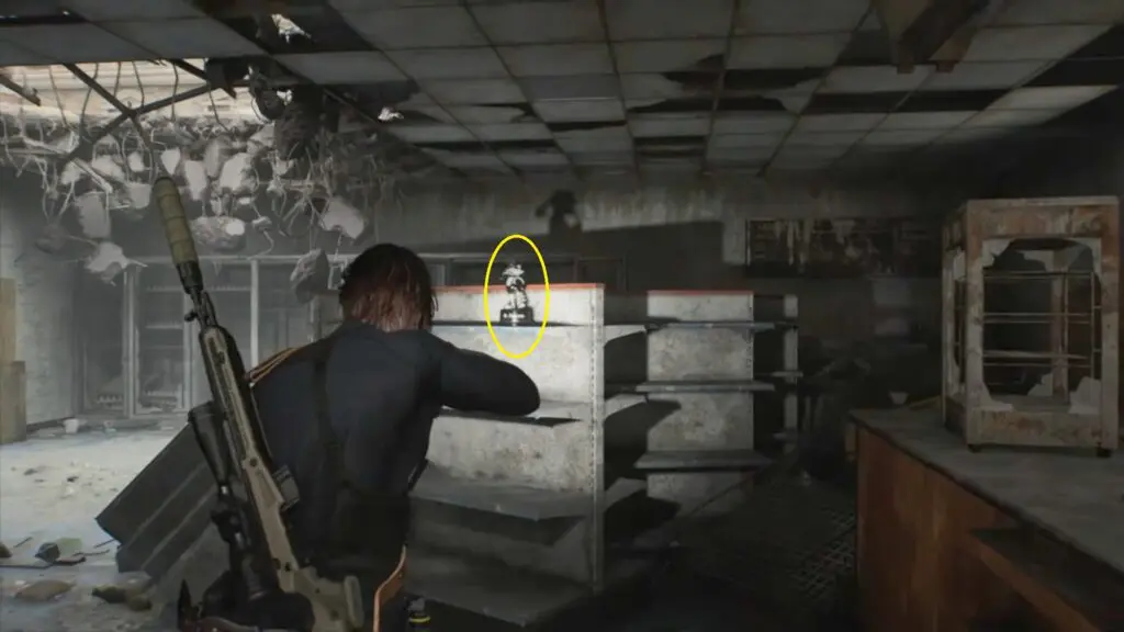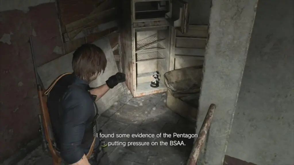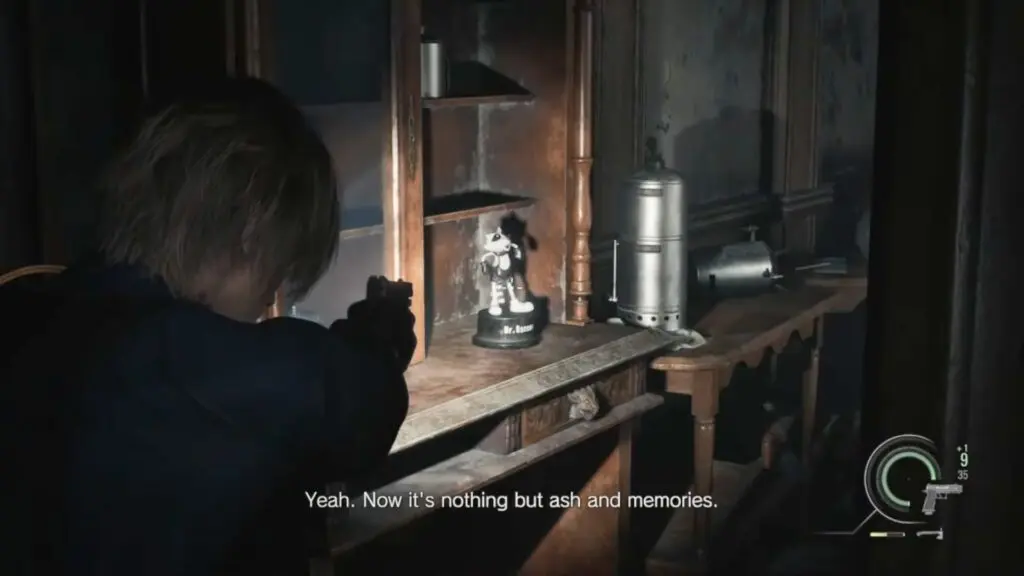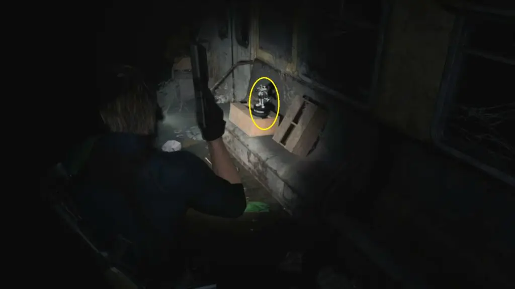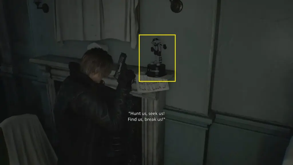 The first Mr. Raccoon can be found during the intro section of Leon’s Care Center. As you progress through the opening, you will reach a blocked door that needs to be cut open with a chainsaw. After cutting the door, go through it and enter the next room. You will find a small dancing raccoon statue sitting on top of the fireplace just before the stairs.