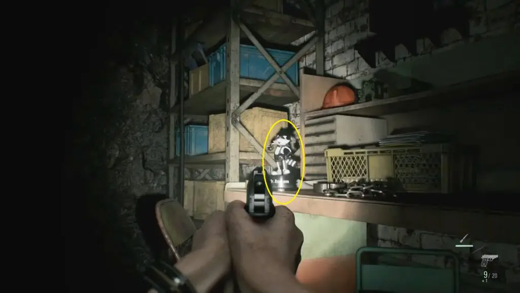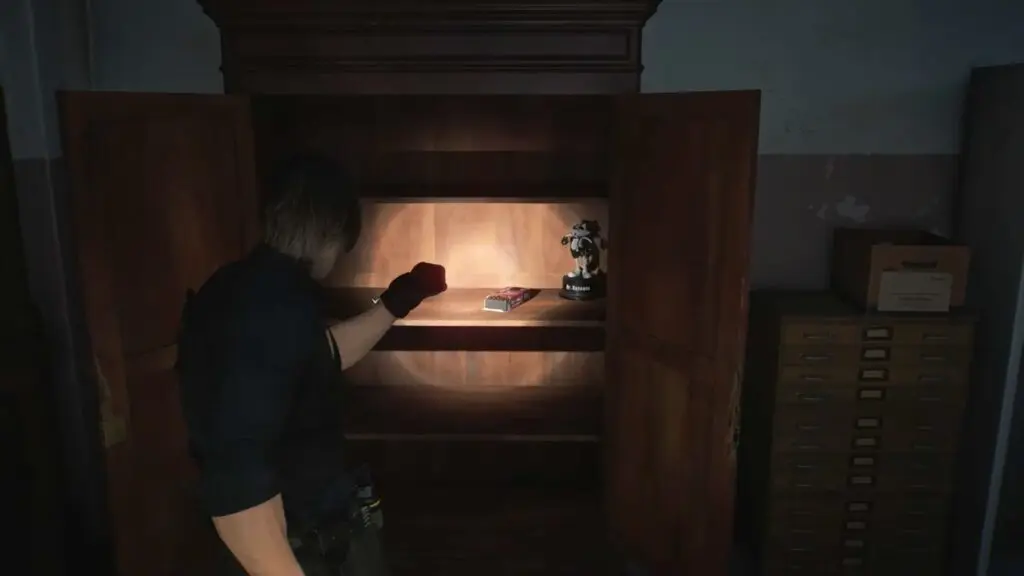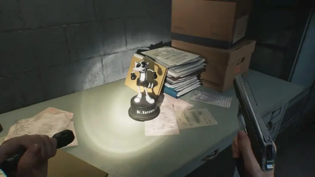 This Mr. Raccoon is inside a closet in the Records Room. The closet cannot be opened the normal way and can only be broken by Leon using his Hatchet.