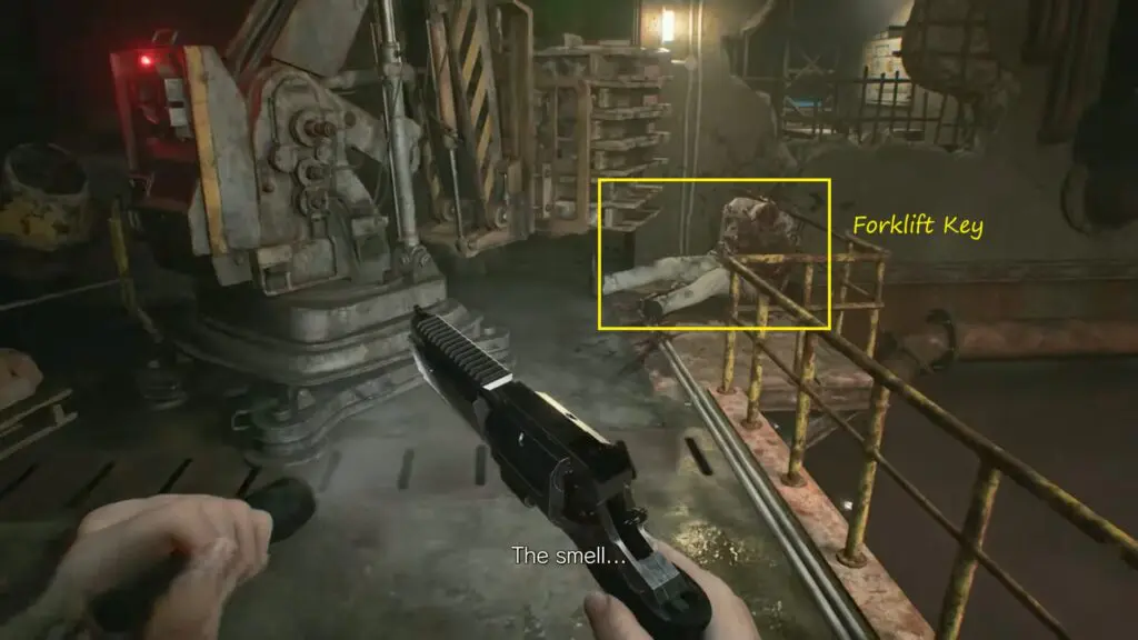 Go west through the new path, crouch through the disabled fan, and enter the Processing Room. Near the forklift, pick up the Forklift Key from a fallen NPC.