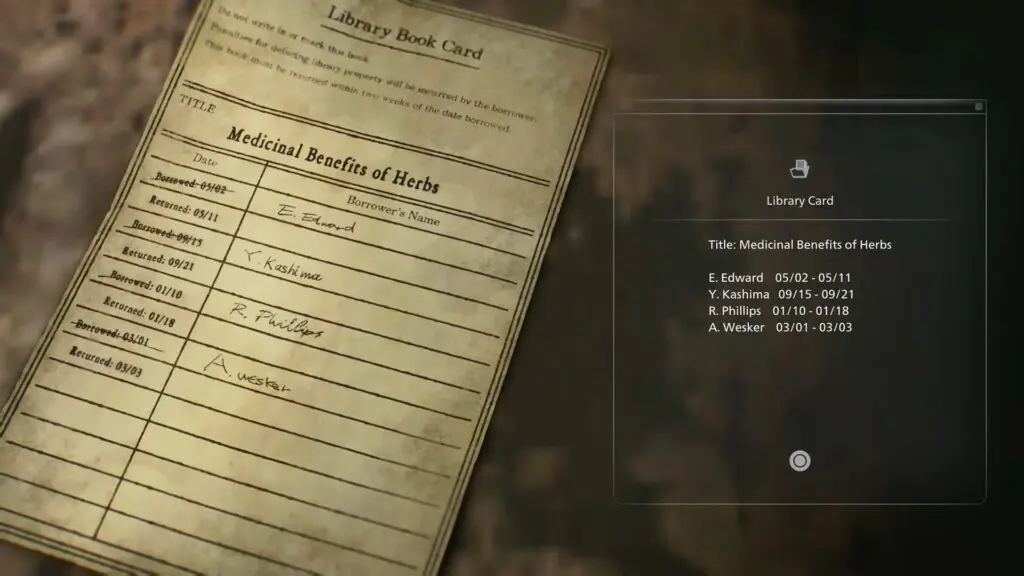 Inside the main S.T.A.R.S. Office, there is a smaller office connected to it. Enter that room and inspect the desk drawer. Inside the drawer, you will find a file. Interact with it and read it. The document is a library card that shows the checkout history of a book titled “Medicinal Benefits of Herbs.”