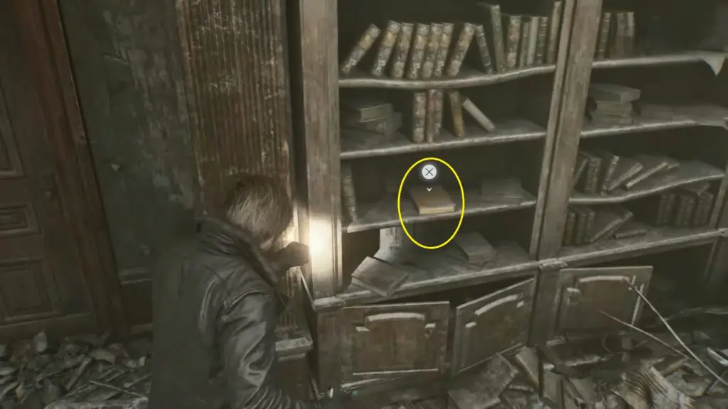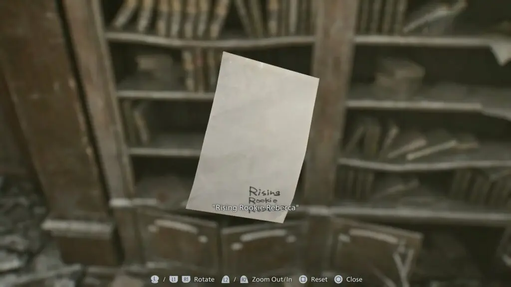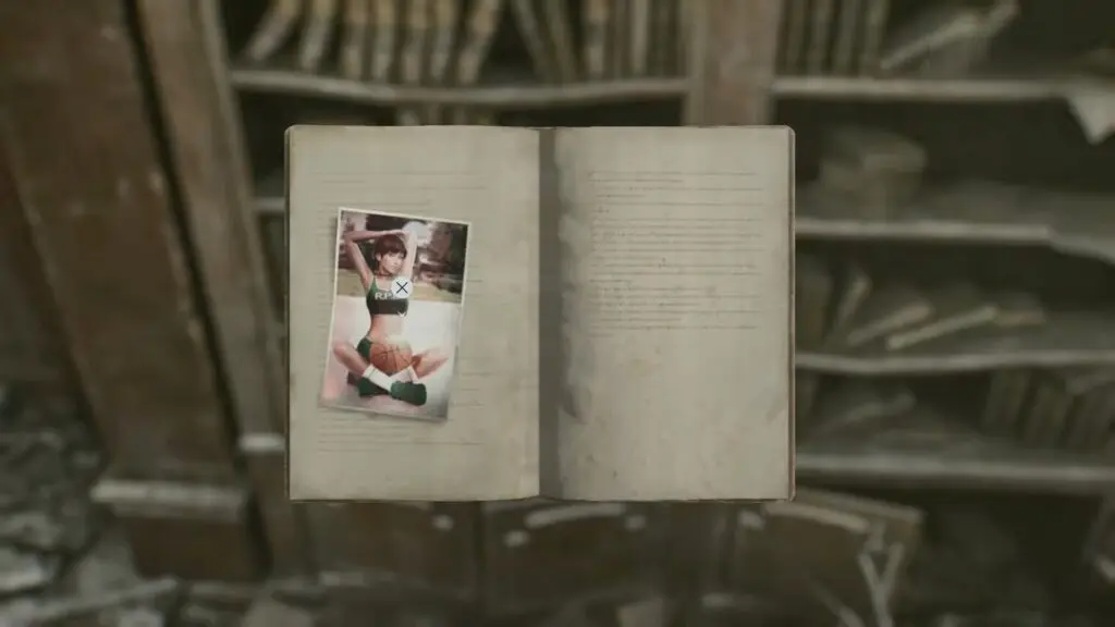 Go to the library located on the same floor as the S.T.A.R.S. Office. Once inside the library, take the stairs up to the second floor. Once you reach the top, walk across the wooden walkway and head toward the door at the end. Just before the door, check the bookshelf on the right side to find a book. Inspect it closely, and you will find a hidden photograph tucked away on the shelf.